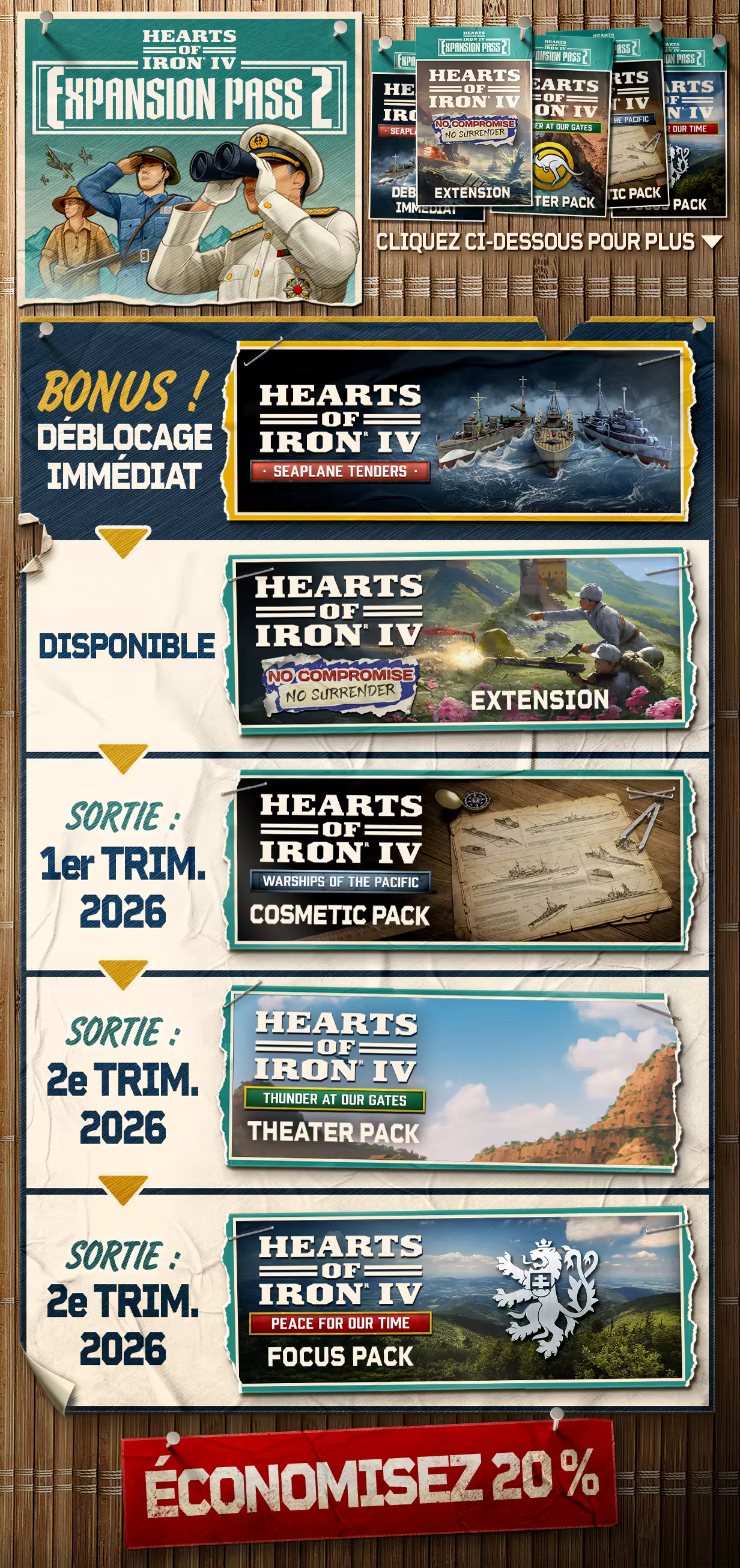 L'Expansion Pass 2 vous propulse au cœur de la guerre du Pacifique, dans laquelle l'ambition impériale, des campagnes féroces d'île en île et des alliances mouvantes décident du sort des nations. Avec un agenda chargé de sorties prochaines à l'horizon, vous déverrouillerez de nouveaux chemins à explorer en refaisant l'histoire à votre gré, que ce soit sous forme d'un empire dominateur se développant dans l'Est ou d'une coalition à toute épreuve capable de repousser des envahisseurs.