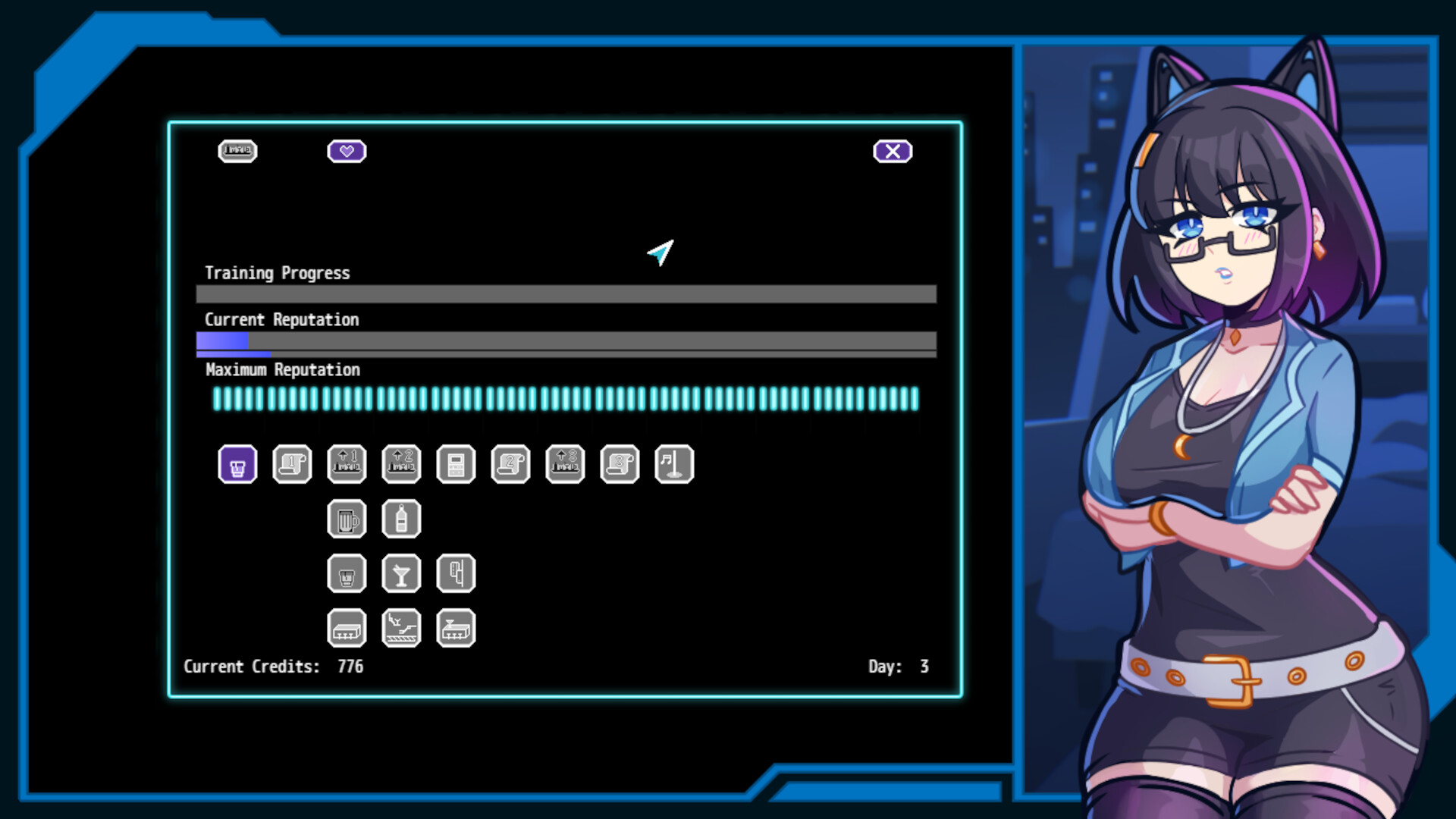 With a high enough reputation, she can unlock the waitress mini-game to bring in more credits and new customers. She has to balance the happiness of each table while avoiding spending too much time lingering with these new handsy customers.