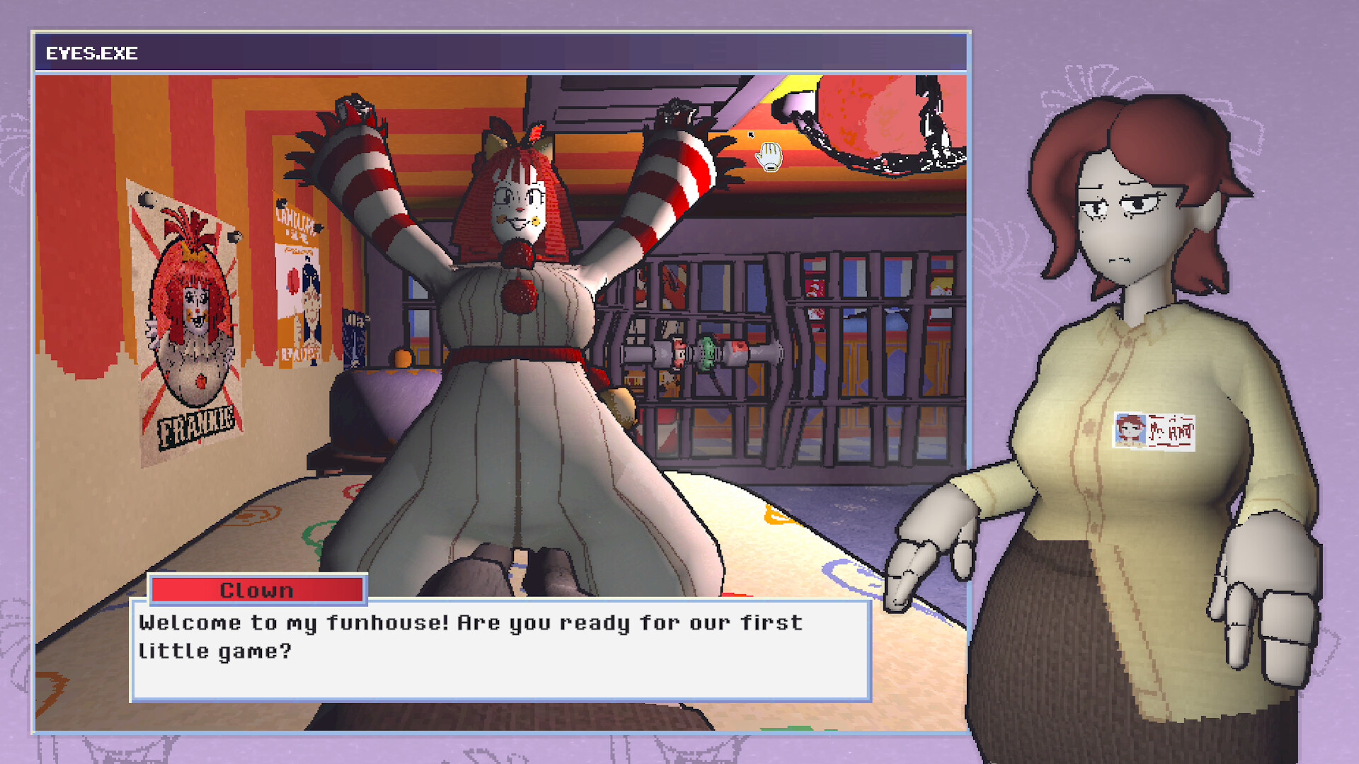 Frankie’s Fun House puts the player in the shoes of Ms. Happ, an extremely depressed employee sent to Frankie’s Fun House for mood adjustment. It becomes quickly clear that this place is not what it seems; the player must guide her escape from the clown and food oriented setting to freedom. The player must move and interact with the world through Ms. Happ to solve puzzles, interact with characters, and ultimately escape.