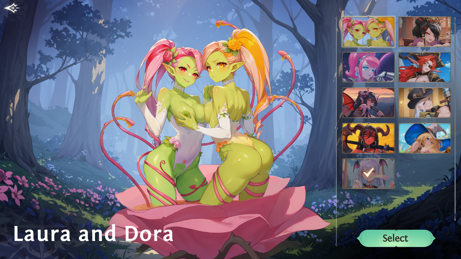 Two blossoms from one wild bloom... Green-skinned twins Laura and Dora, grown to ripe perfection and ready to steal your heart. Laura is the calm and thoughtful one—she prefers slow caresses, lingering kisses, and heartfelt talks under the moonlight. Dora is the complete opposite. Loud, lewd, and shameless—the kind of forest nymph who's happy to ride you on the nearest tree stump while tossing dirty jokes at her sister.