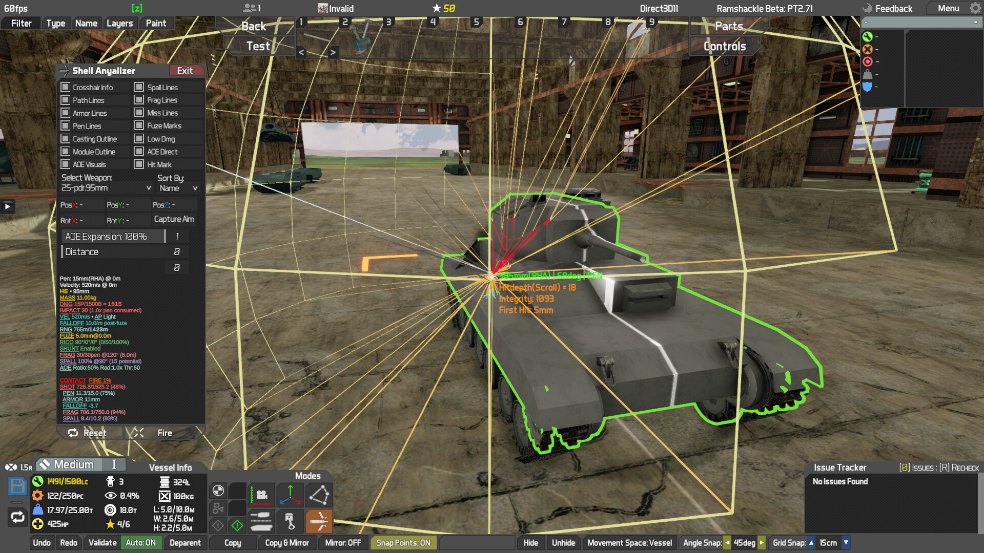 Ramshackle is a twist on the vehicular build-and-combat genre. Instead of piecing together blocks, you construct vehicles (referred to as "vessels" in-game) with point-placed struts and armor plates as the core structure. Functional modules like wheels, tracks, and weapons integrate into this framework, but they only work when powered by engines, transmission lines, and ammunition. Combat then plays out with simulated ballistics: angled armor can deflect rounds, while a well-placed shot into an ammo rack can tear a vehicle apart from the inside.