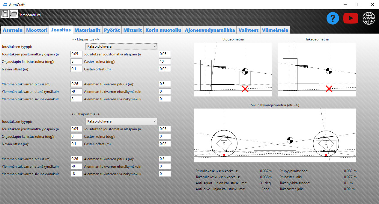 🧠 Realistinen ajodynamiikka – Simuloi ja säädä ohjattavuutta, painonjakoa ja käyttäytymistä.