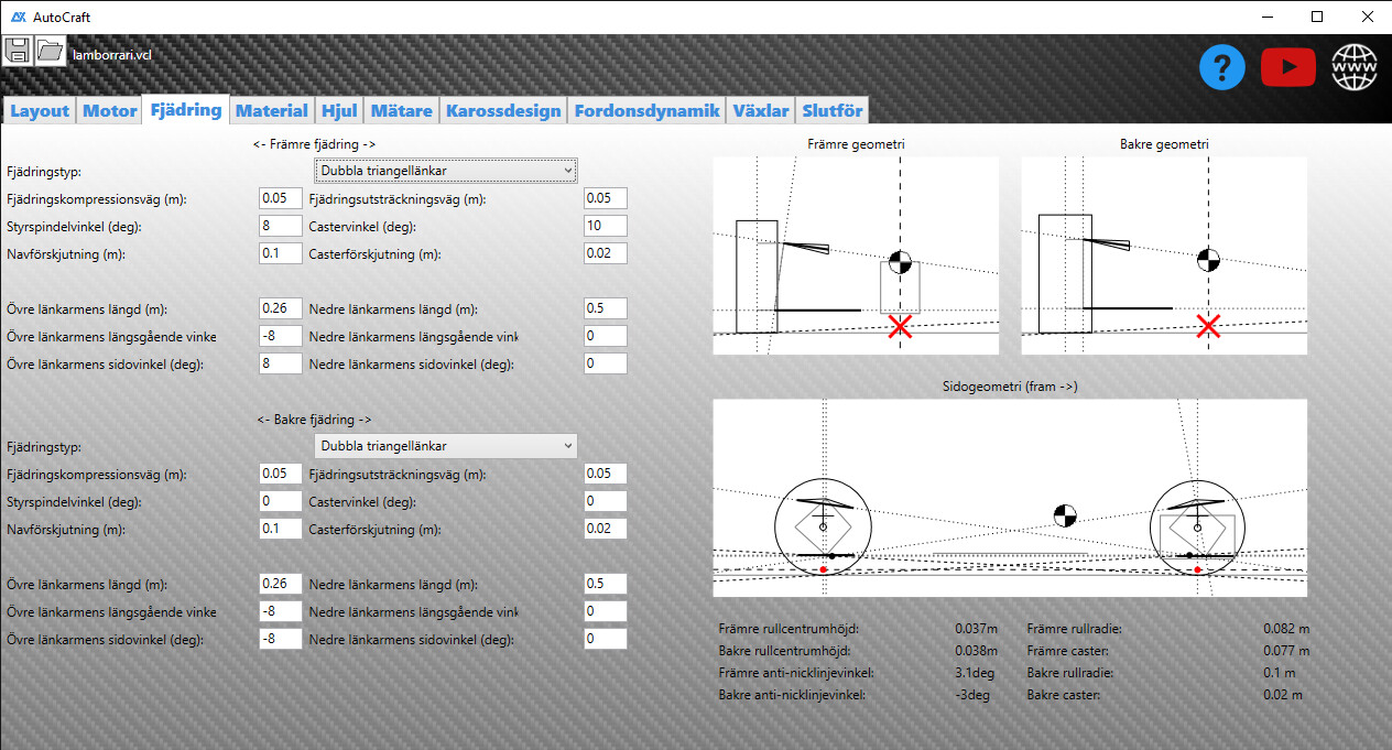 ⚙️ Designa varje komponent – Anpassa drivlinelösningar, motorer, fjädringstyper och geometri.