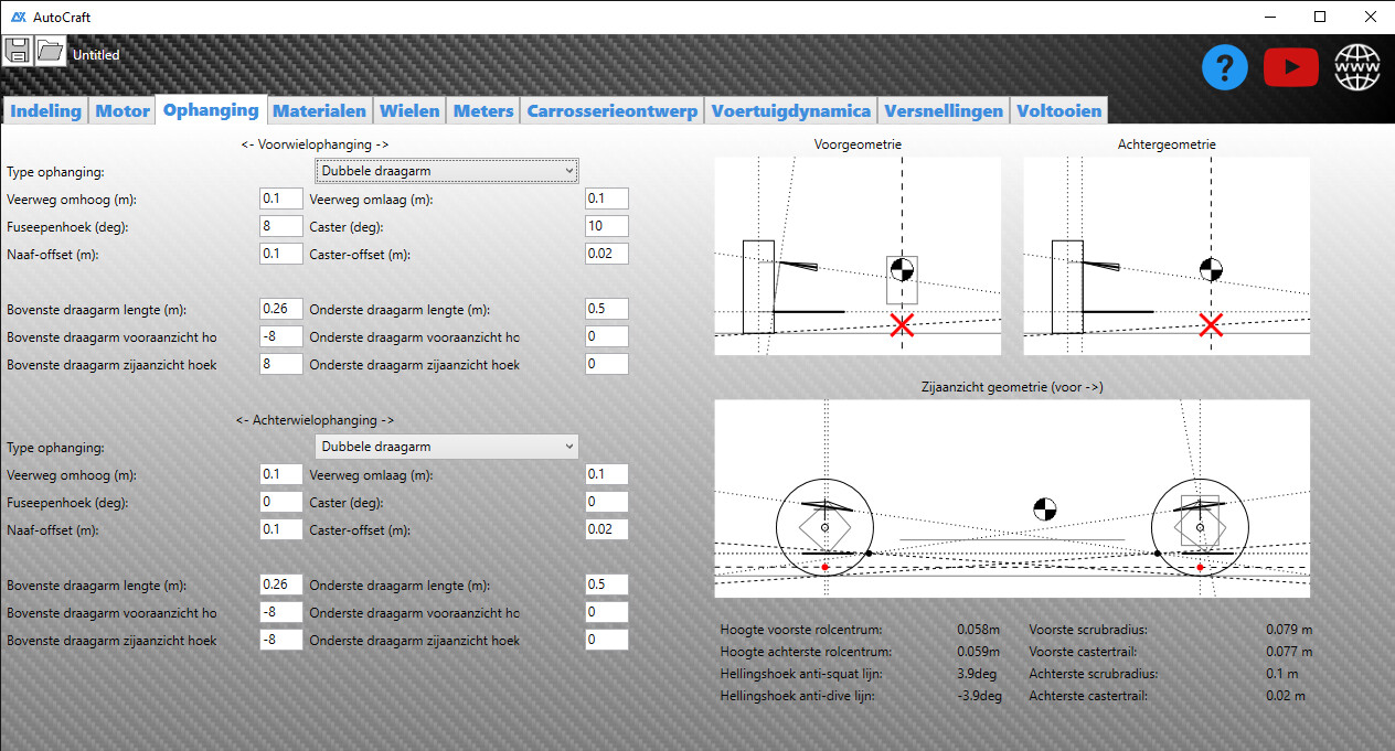 ⚙️ Ontwerp elk onderdeel – Pas aandrijflayouts, motoren, ophangingstypen en geometrie aan.