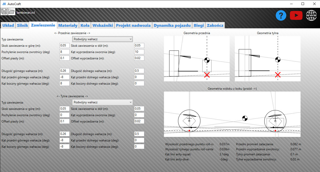 AutoCraft to aplikacja Windows do projektowania pojazdów: silnik, zawieszenie, układ napędowy, nadwozie 3D i więcej. Eksportuj projekty do BeamNG.drive przez naszą stronę.