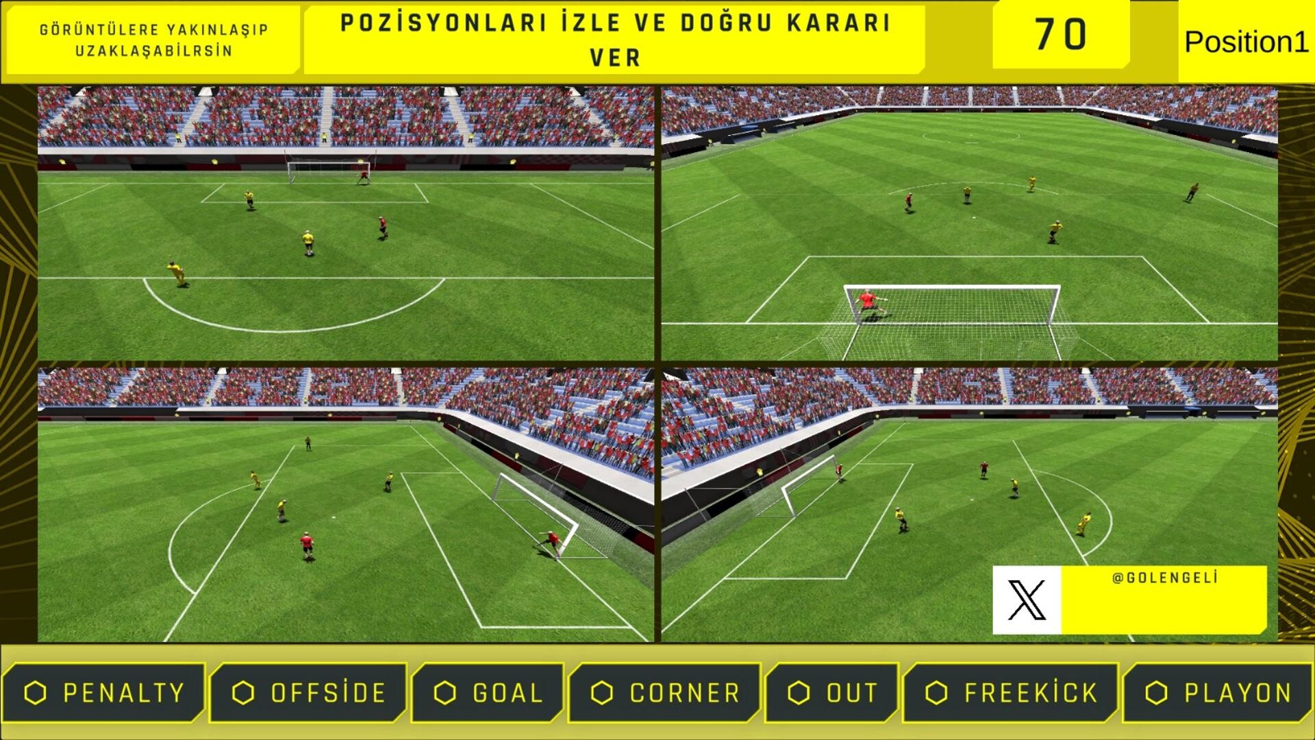 Carefully examine the positions taken from real match moments, carry your team to victory by making fast and correct decisions. It will both test your football knowledge and have adrenaline-filled moments. This game, full of funny and engaging moments, will sometimes be difficult to decide, and sometimes there will be fun involved.