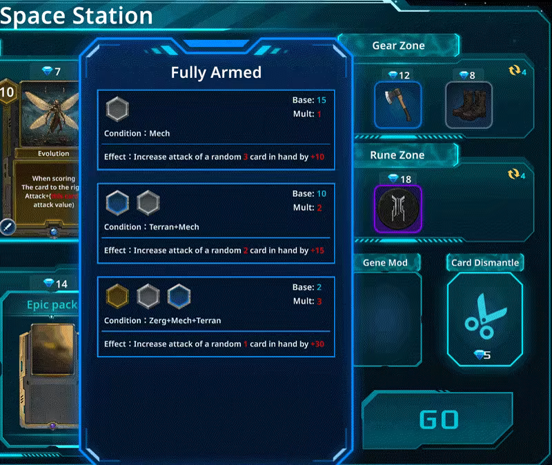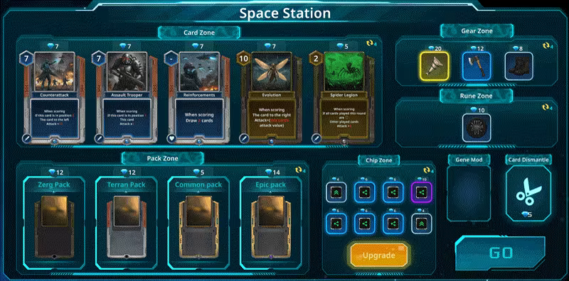 At the space station, you can purchase cards, equipment, and runes, dismantle cards, and even upgrade them!