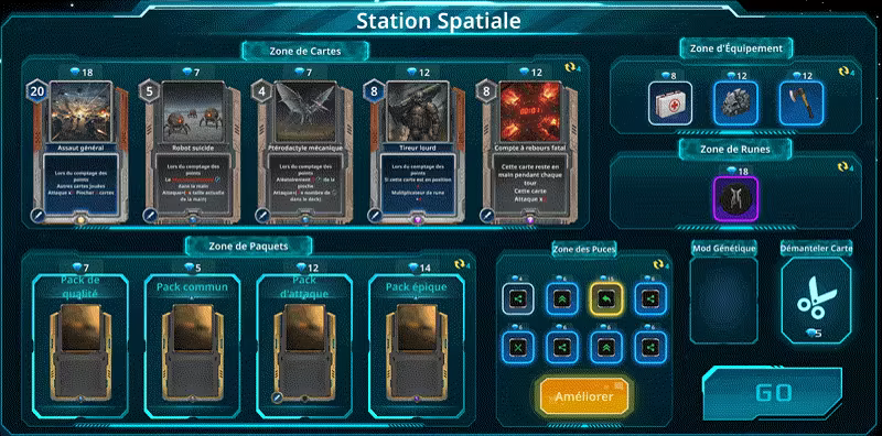 À la station spatiale, achetez des cartes, des équipements, des runes, démontez des cartes et améliorez-les !