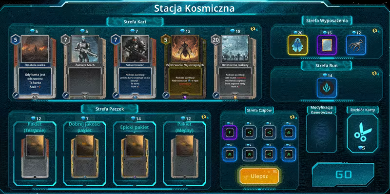 Na stacji kosmicznej możesz kupować karty, ekwipunek i runy, demontować karty i ulepszać je!
