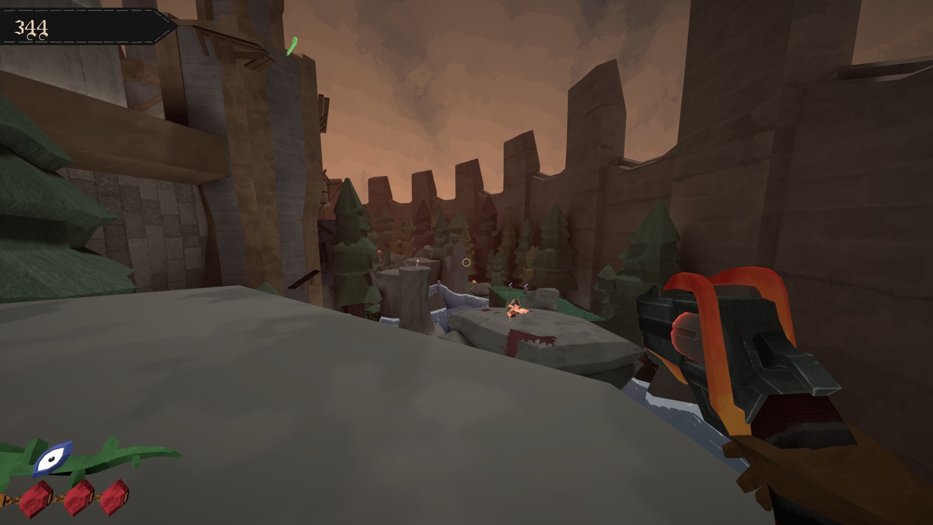 Retro shooter gameplay which encourages the player to use movement mechanics while fighting. Lots of intimidating bosses and enemies. Features a precise parry system which is tied to swapping weapons. Parrying with specific weapons will "charge" them, giving them a special attack.