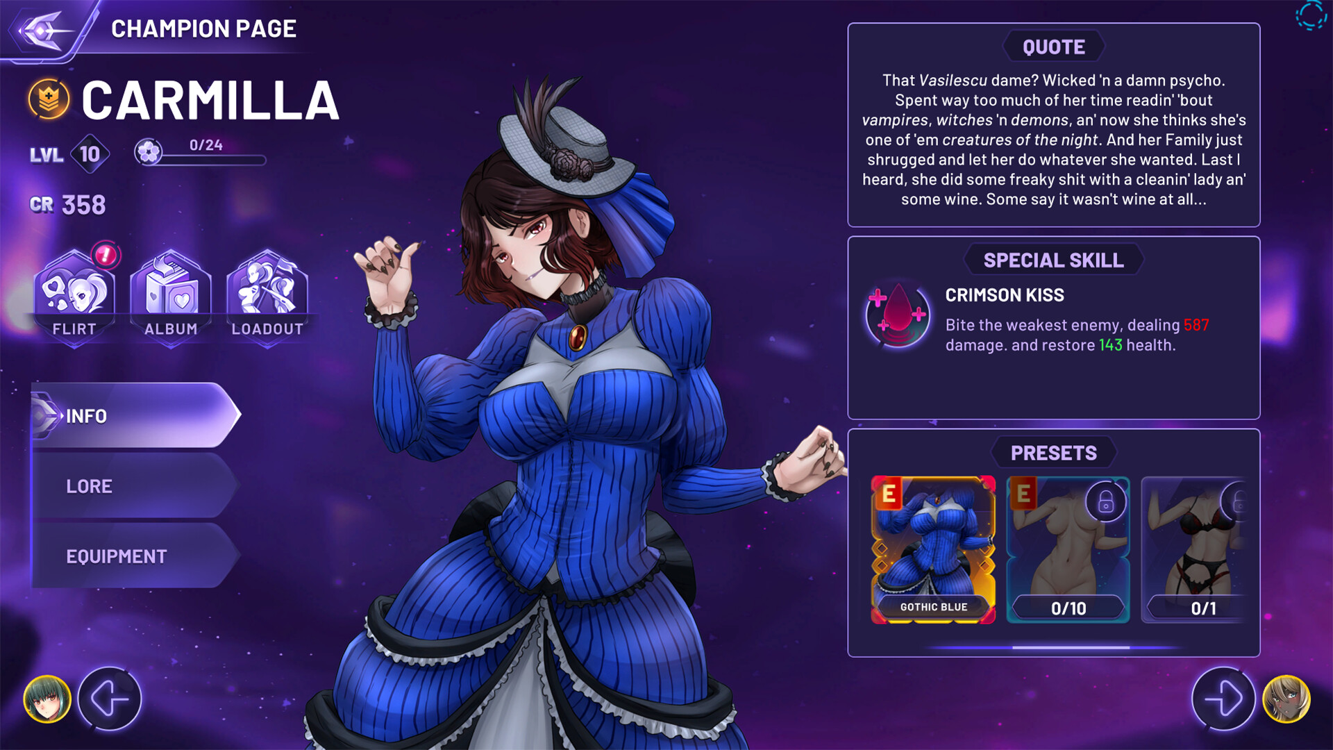This DLC unlocks the legendary champion - Carmilla, with 120 trust, enough to immediately reach level 10.