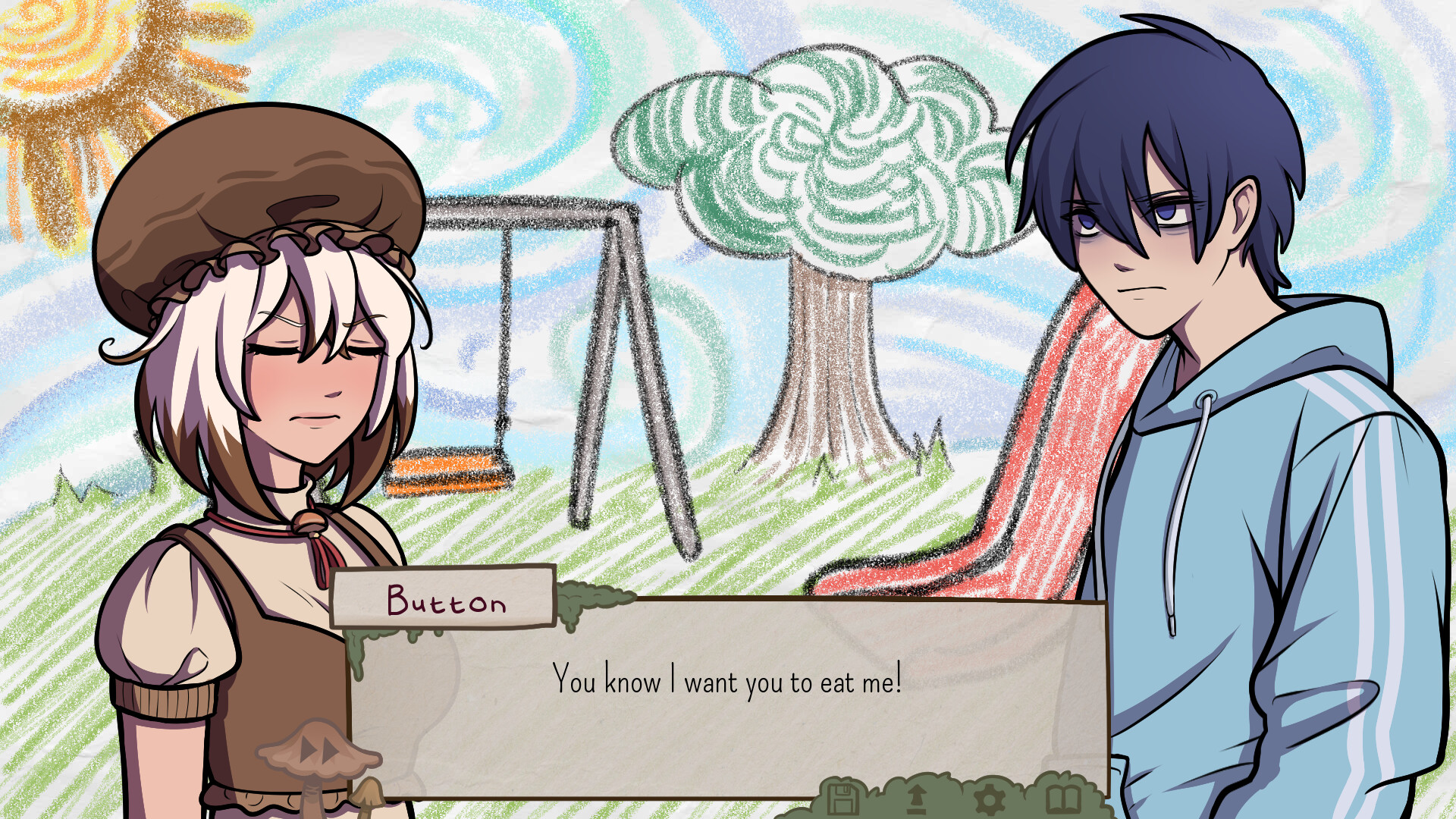 Manage Button's mental health and affection carefully. Make your story as horrific or as heart-warming as you desire!