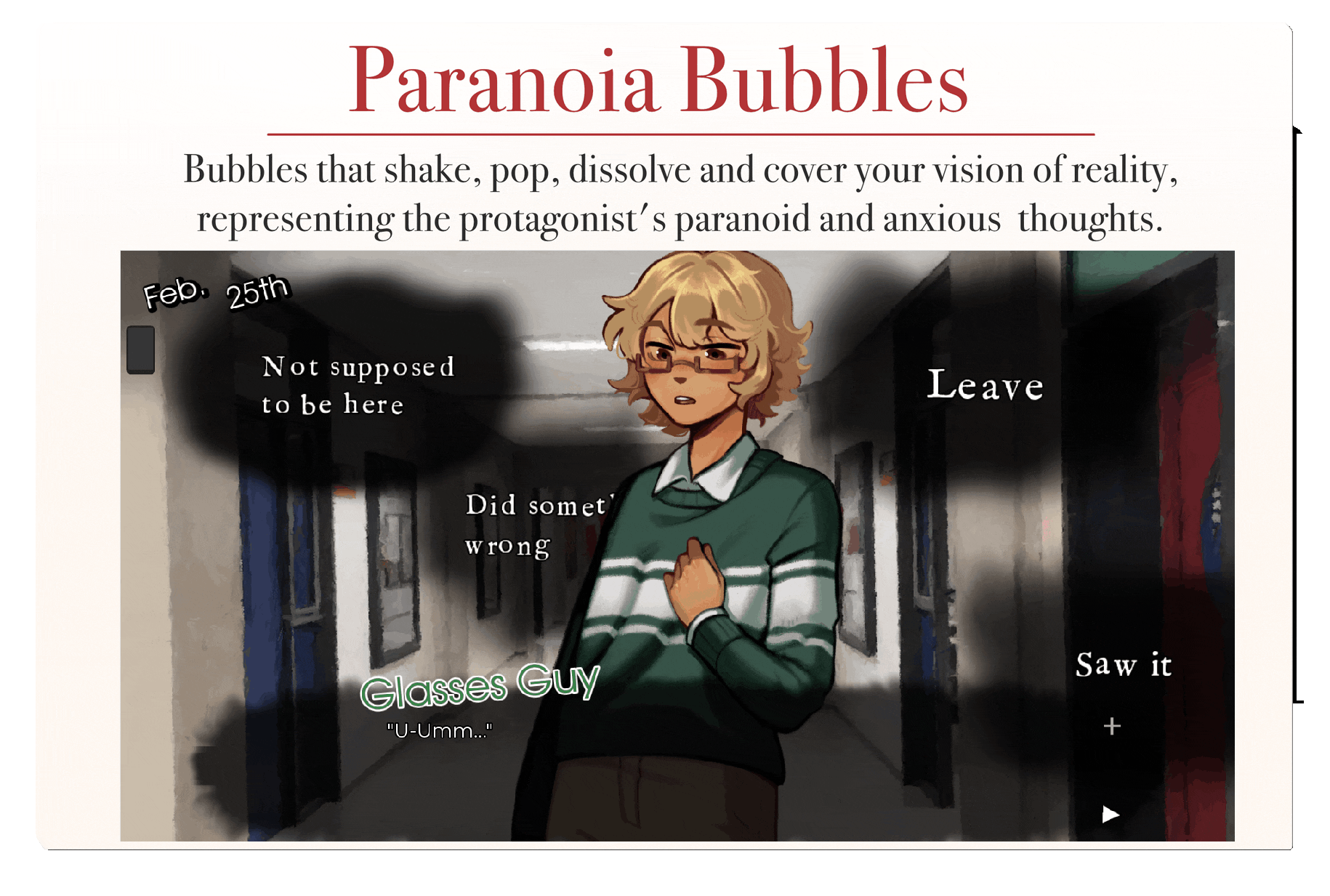 Bubbles that shake, pop, dissolve and cover your vision of reality, representing the protagonist's paranoid and anxious thoughts.