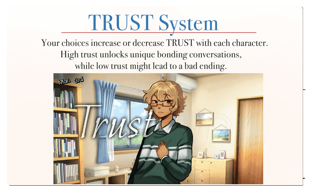 Your choices increase or decrease TRUST with each character. High trust unlocks unique bonding conversations, while low trust might lead to a bad ending.