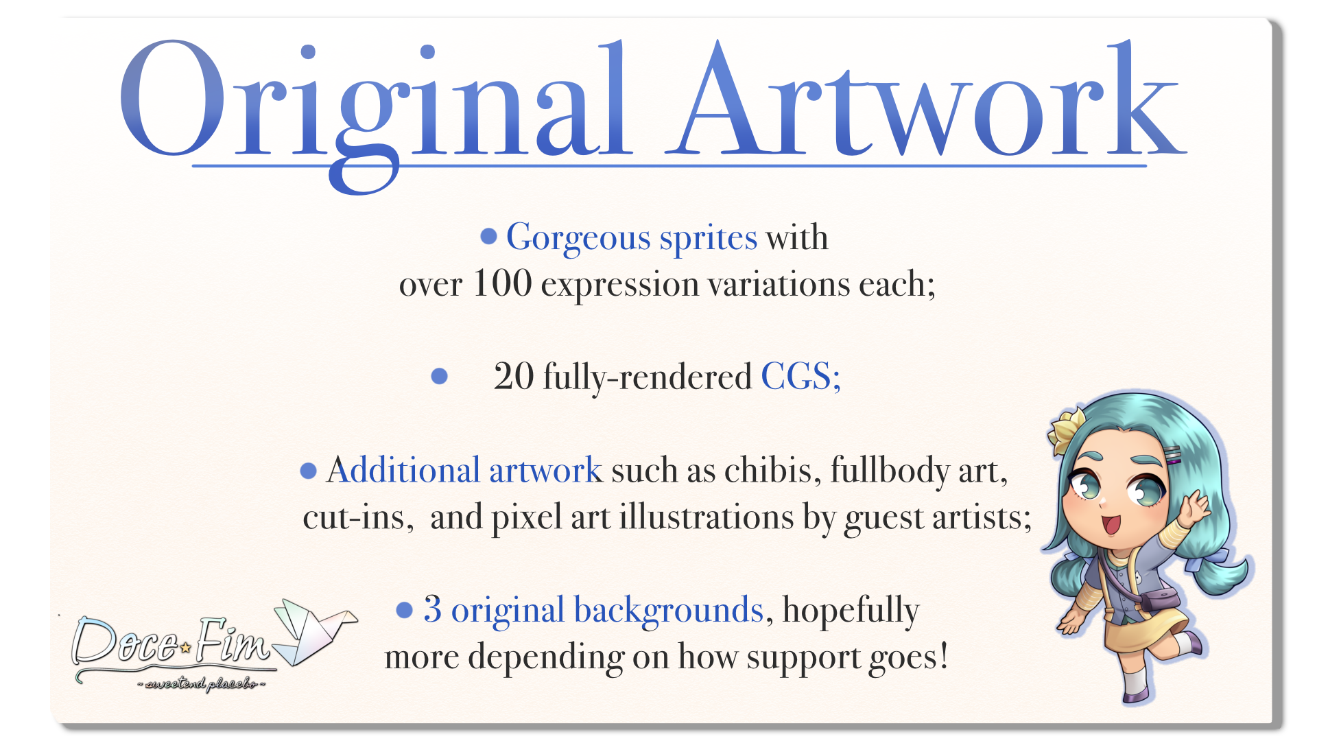 Additional artwork such as chibis, fullbody art, cut-ins, and pixel art illustrations by guest artists;