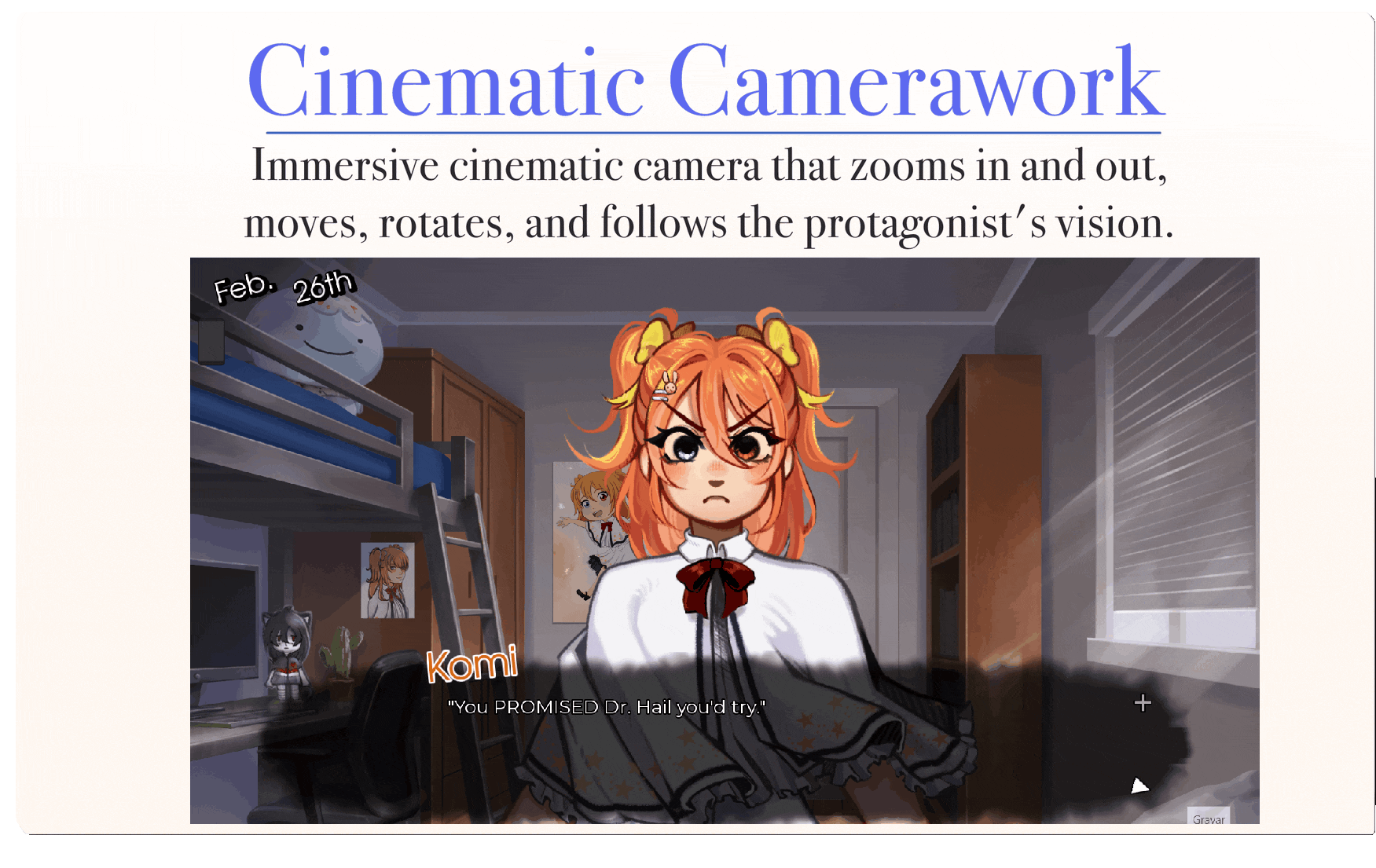 Immersive cinematic camera that zooms in and out, moves, rotates, and follows the protagonist's vision.