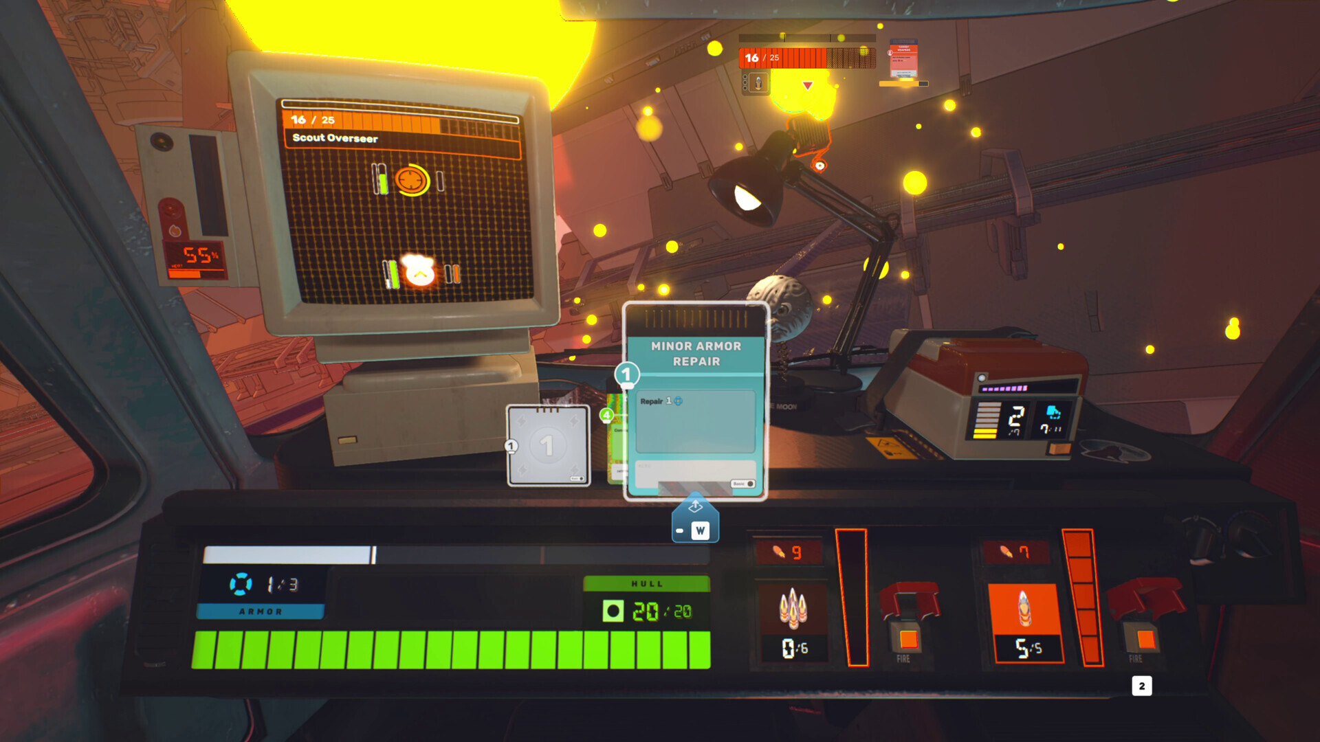 In Night Machine, your ship's systems are controlled by a card interface. Build and refine your deck as you delve deeper into the moon's treacherous interior. Start with a basic loadout and expand your options as you progress. Discover synergies, craft powerful combos, and adapt your strategy as you face a constant stream of threats and opportunities, testing your reflexes and decision-making skills.