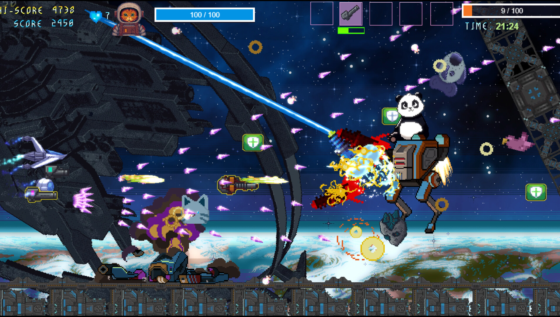 With your Satellite drone ship orbiting by your side — firing, spinning, and adding extra purr-powered firepower — claw your way through waves of deadly enemies and unexpectedly cute cosmic chaos. Battle mechanical overlords, dodge colourful bullet patterns, uncover why humanity vanished, and face the giant adorable creatures now roaming the stars