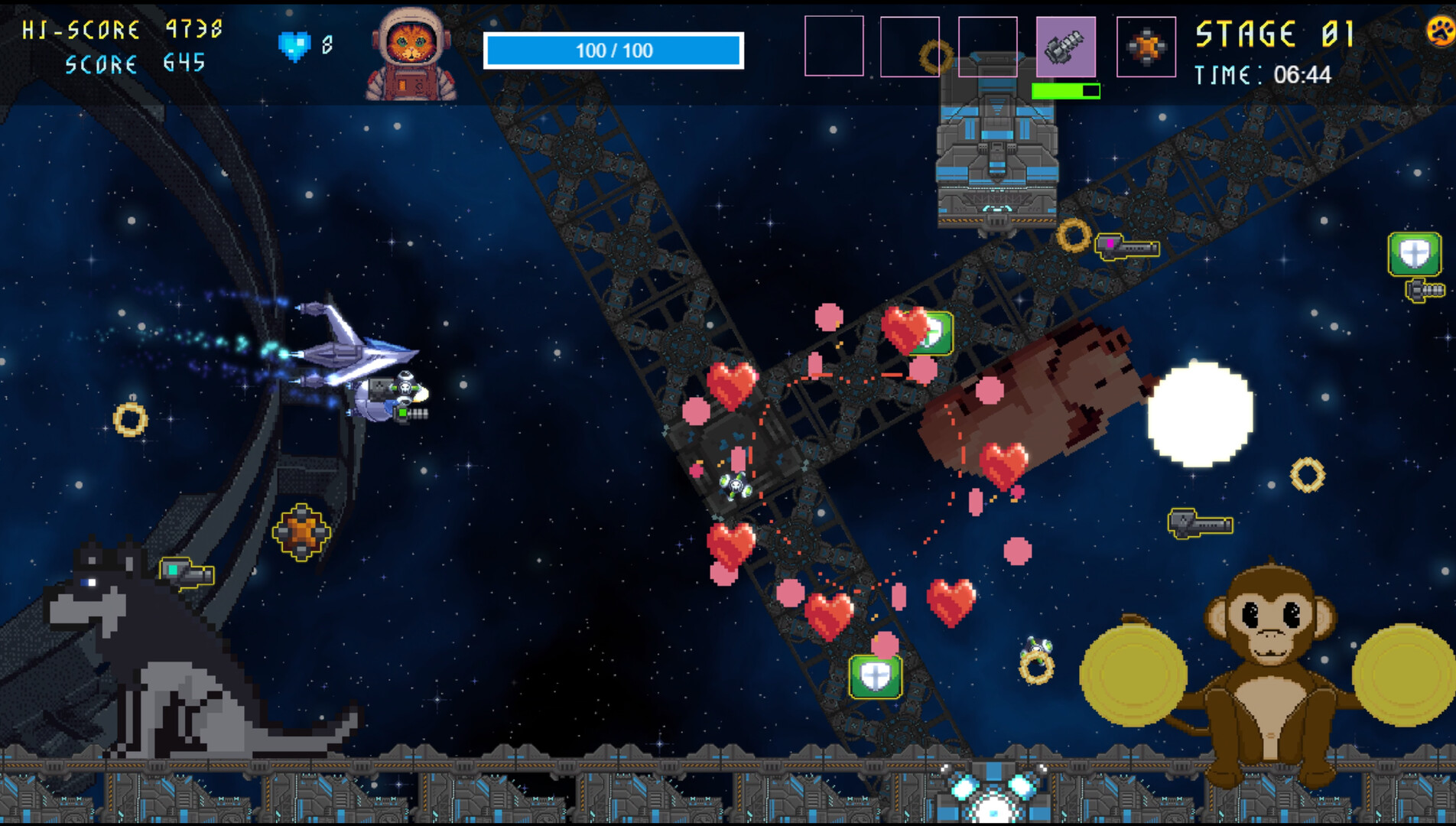 With your Satellite drone ship orbiting by your side — firing, spinning, and adding extra purr-powered firepower — claw your way through waves of deadly enemies and unexpectedly cute cosmic chaos. Battle mechanical overlords, dodge colourful bullet patterns, uncover why humanity vanished, and face the giant adorable creatures now roaming the stars
