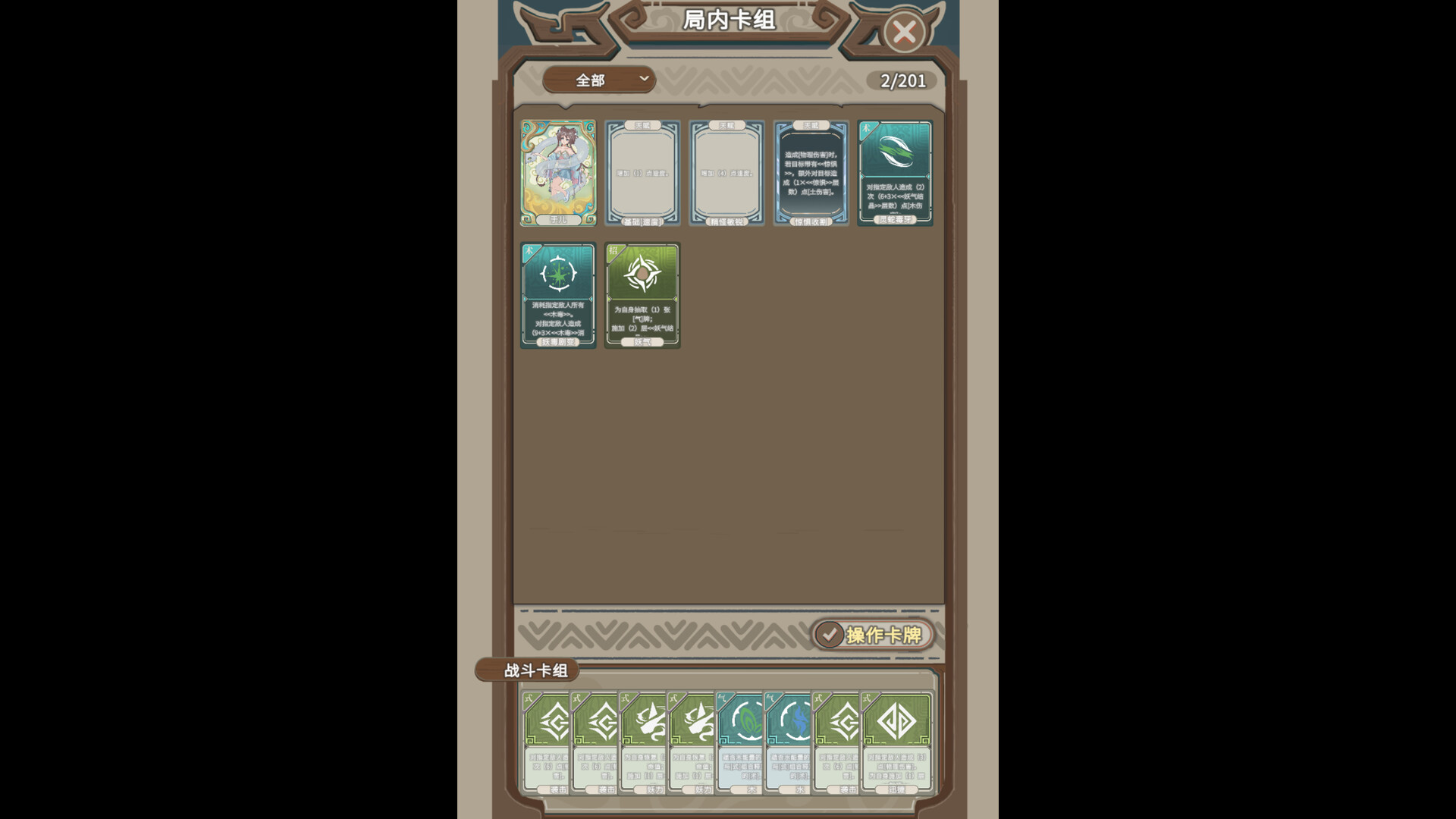式牌:战斗中的基础牌,一般不造成五行伤害,可以单独打出,在拥有招术牌后也可以和其他气、式牌组合改变、触发额外效果。