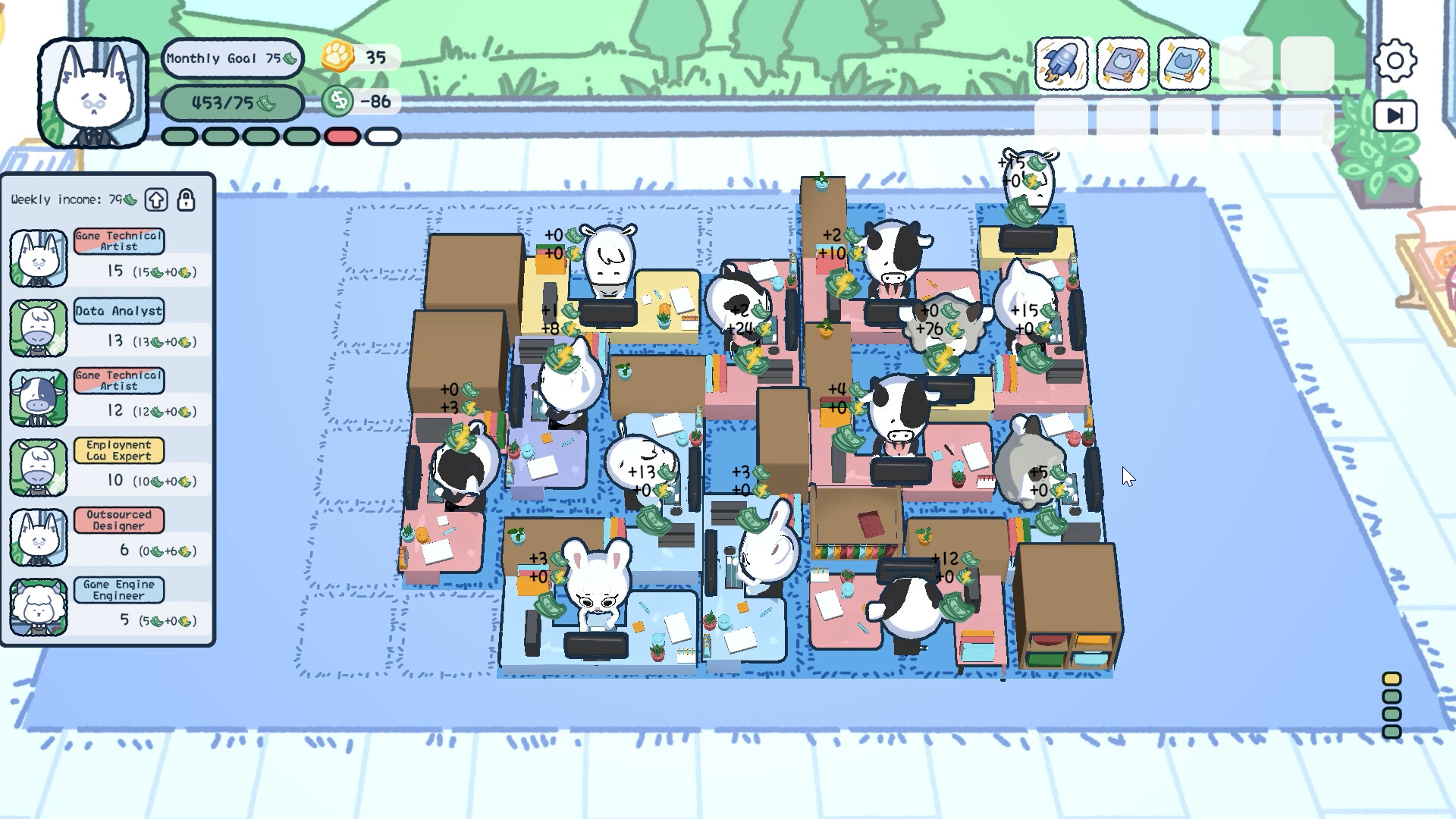 The company’s profits depend not only on your choice of employees, but even more on how you arrange their workstations! Seat data product managers next to programmers, place the chief designer with the artists… Arrange the workstations well to maximize efficiency!