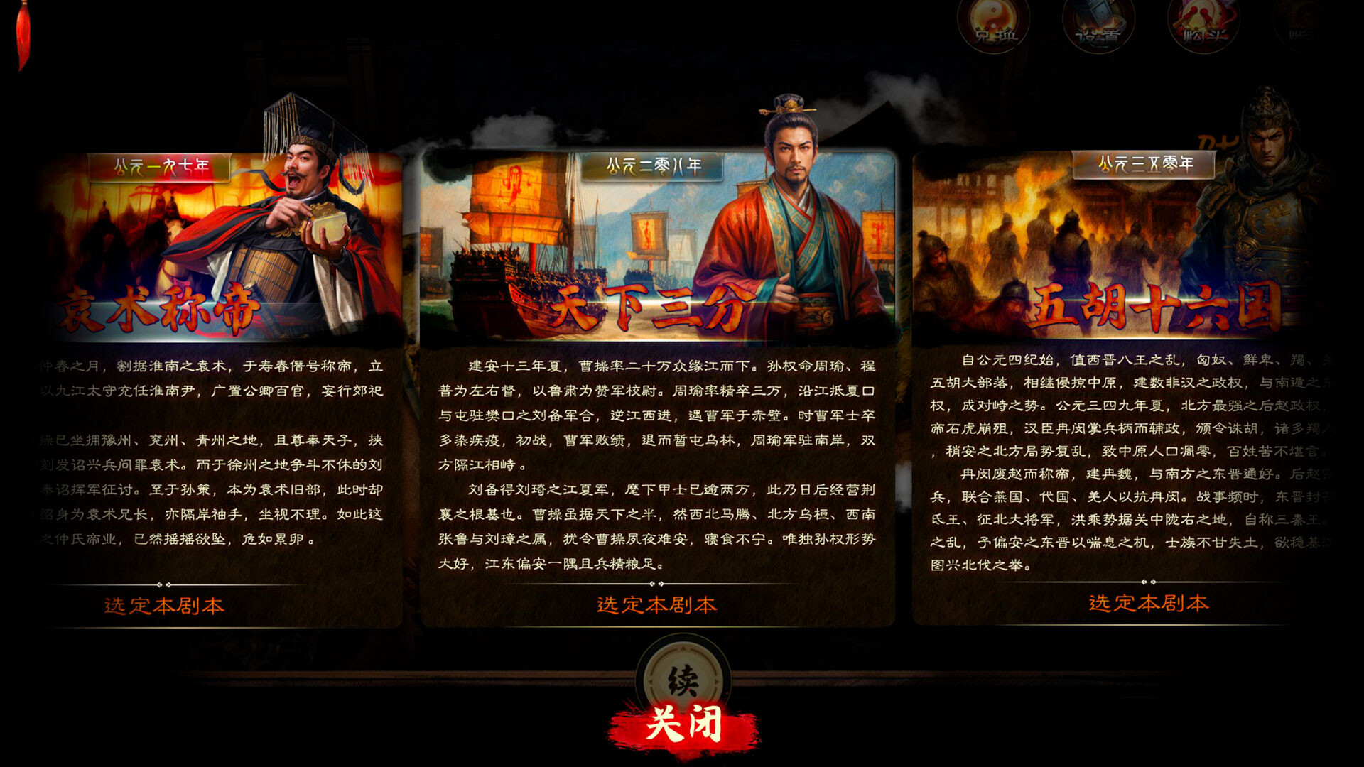 游戏核心玩法:大地图操作,种田、纳贤、治理、造物、贸易、建军、攻城略地、坚守要隘保一方平安。首发版本包含了六个历史剧本,包括秦末·楚汉之争、汉武帝·开疆拓土、三国·群雄割据、三国·袁术称帝、三国·赤壁之战、五胡十六国。