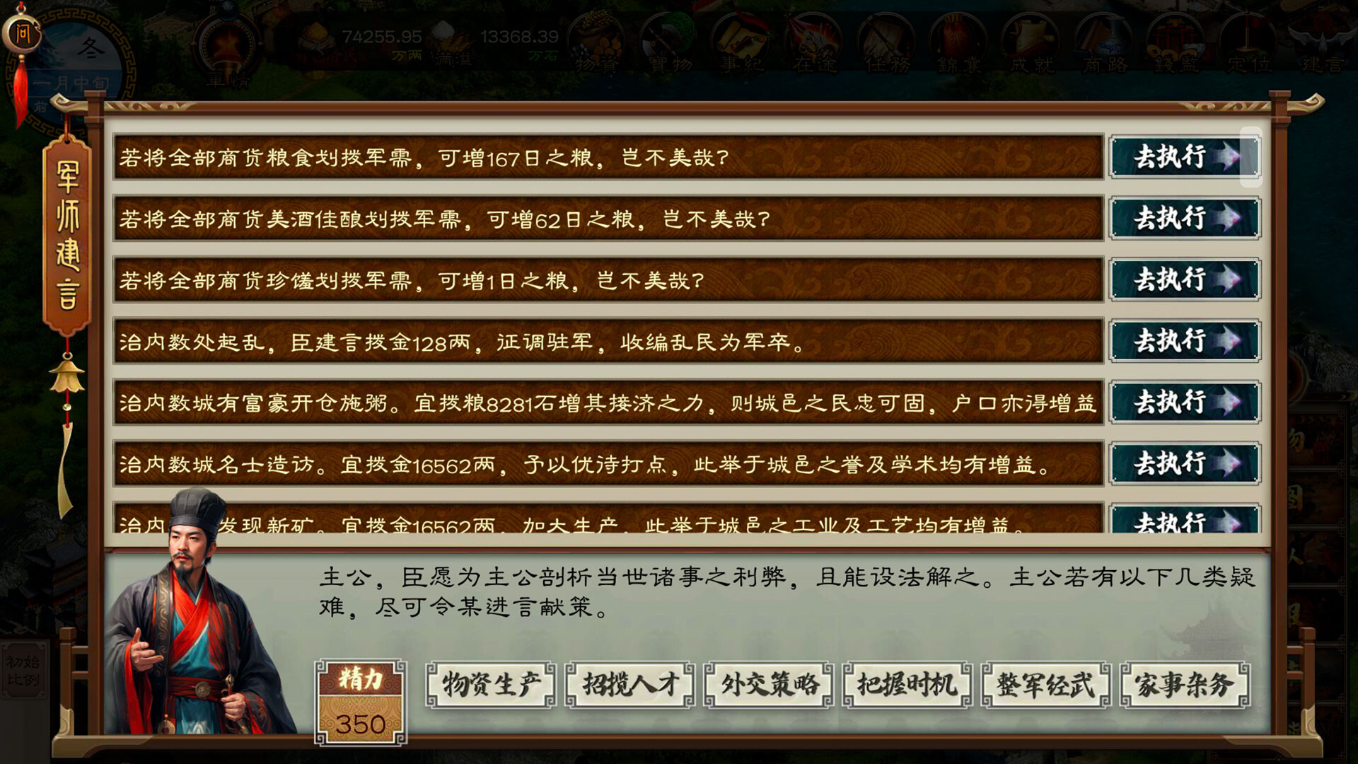 我们把全部生产设定为“官营”方式,就是官家负责所有生产工人的工资,所产产品全归官家自由使用或出售。所以跑商、组建军队、送礼及生产环境调用材料,都无需支付费用。跑商是获得收入的重要途径,由于现在所有商品属于官家,所以商队的意义在于运输产品到其他地方的市场。但由于商品种类繁多,有些需要,有些可售,所以新增了商品待售区。在待售区里面的商品,商队和军师都可以随意变卖。