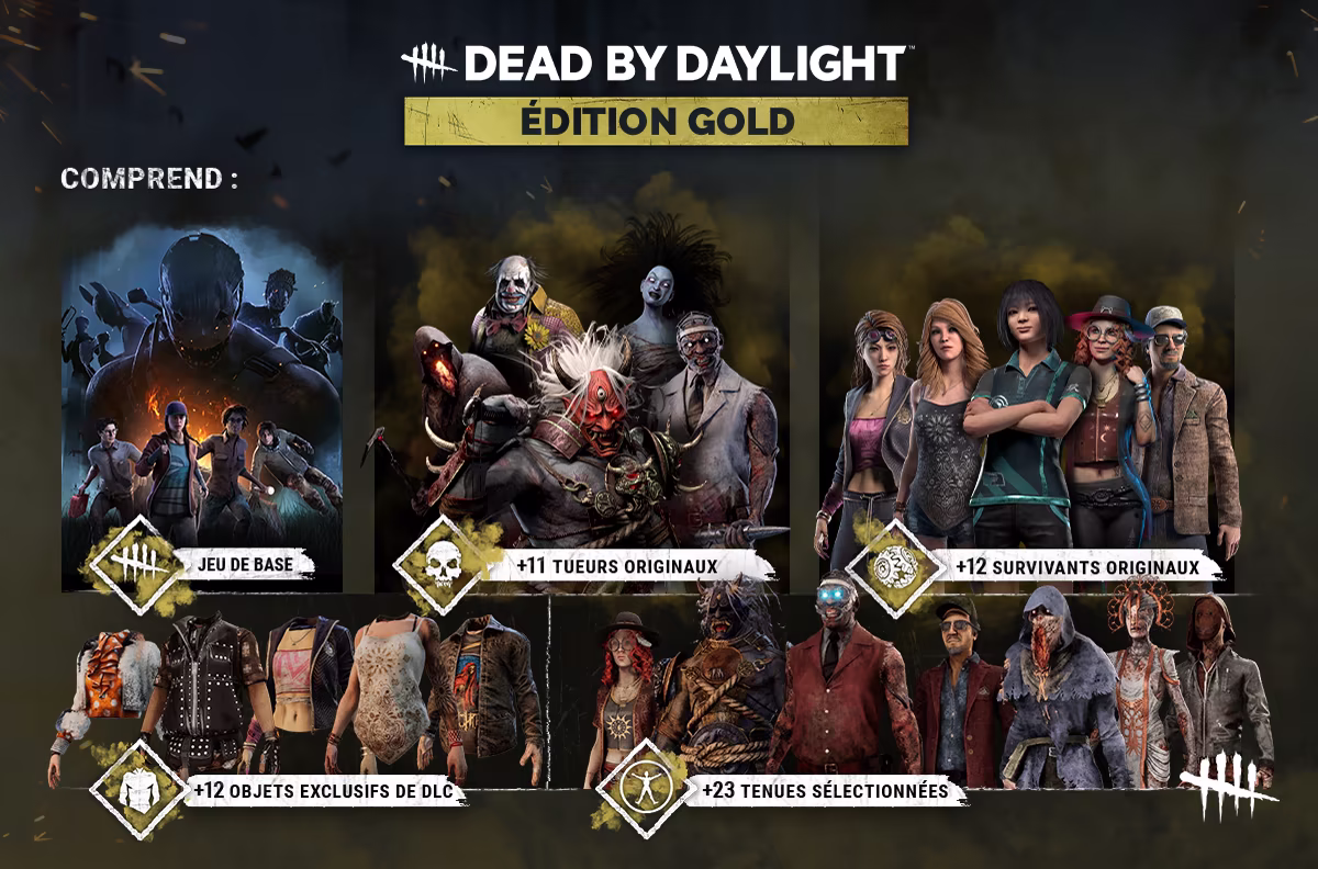 Plongez dans l'horreur avec l'édition Or de Dead by Daylight, qui inclut 11 tueurs originaux, 12 survivants originaux, des tenues supplémentaires et des objets exclusifs de DLC issus du jeu de base, et bien plus encore.