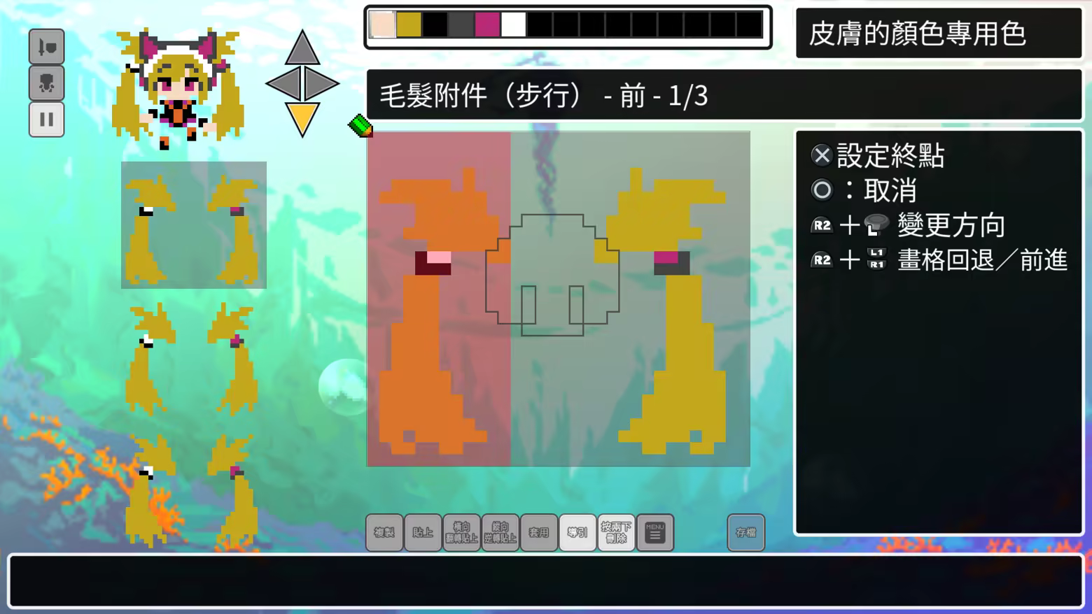 玩家角色的外觀可以使用遊戲中的點陣工具自由重繪,不僅是臉部,還有身體、四肢、武器、盾牌,甚至是飛行武器。您也可以創作各式各樣的音樂!創造您自己的原創。