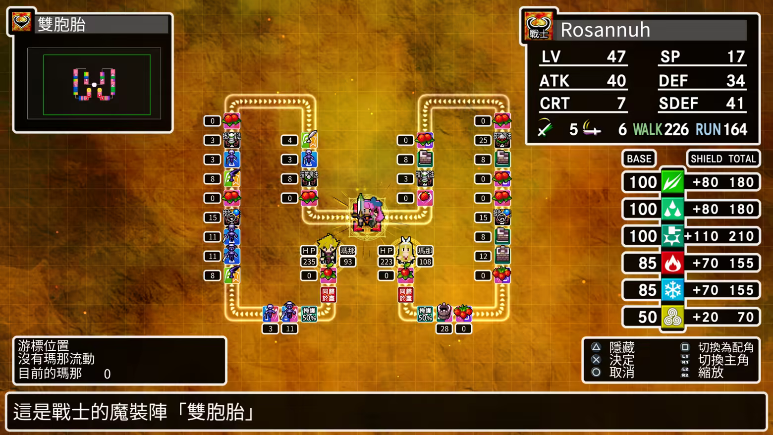 魔裝陣是將主角與配角放置在魔裝陣中一字排開的方格中,並放置強化道具來強化主角的系統。有超過 200 種不同的 魔裝陣。使用越多,就越能強化角色!與您一起探索地牢的「配角」也會獲得經驗並提升等級。您可以使用 [魔裝陣],更有效率地發展您的角色,讓您設定更多的 [配角]。