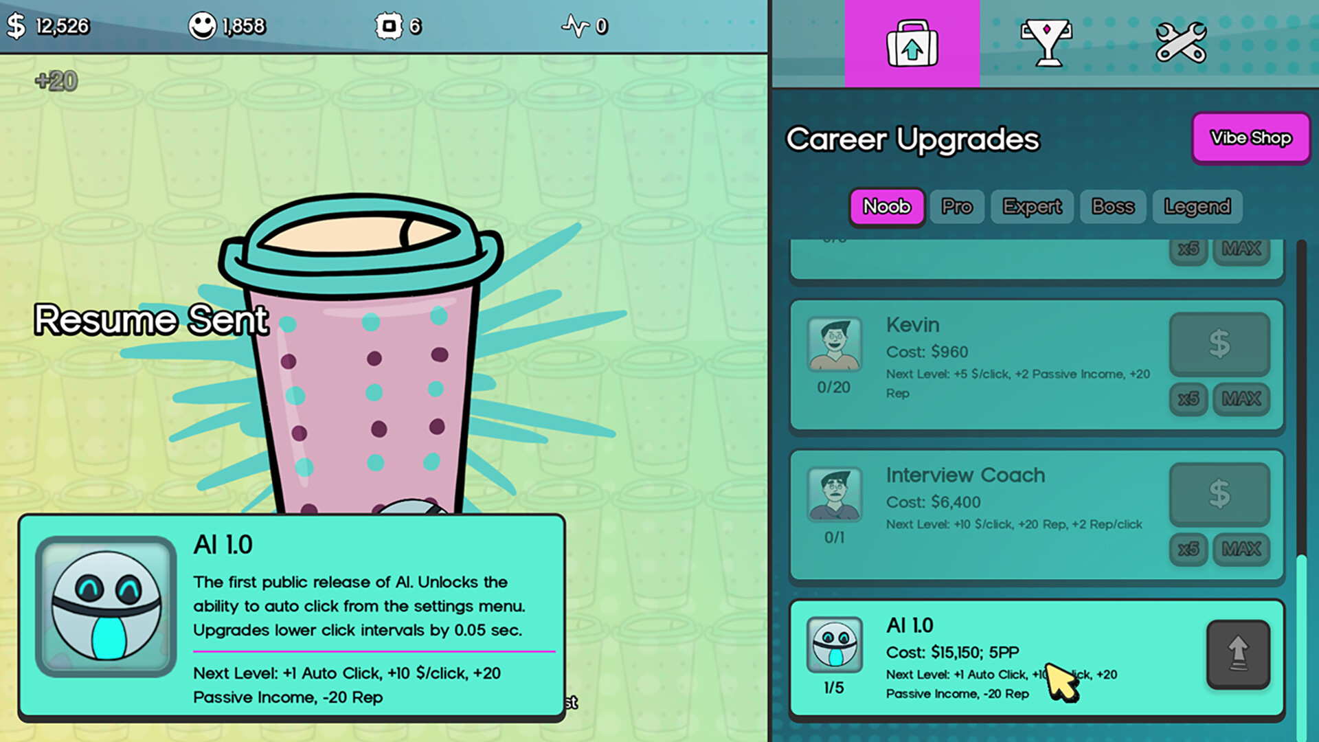 An idle clicker where you evolve from college graduate to Vibe Lord. Click, automate with AI tools, manage resources, and discover multiple endings in this satirical take on modern work life.