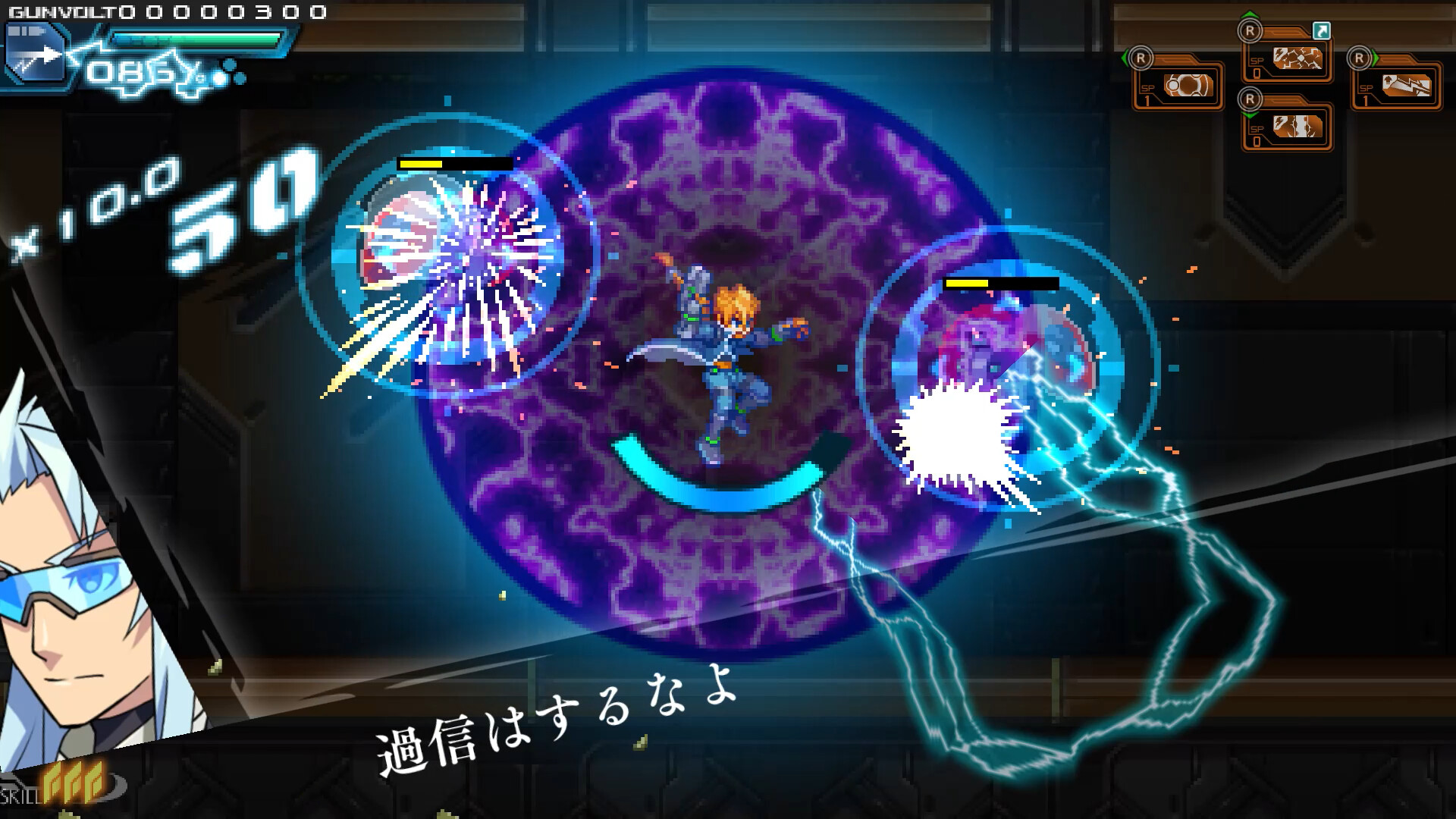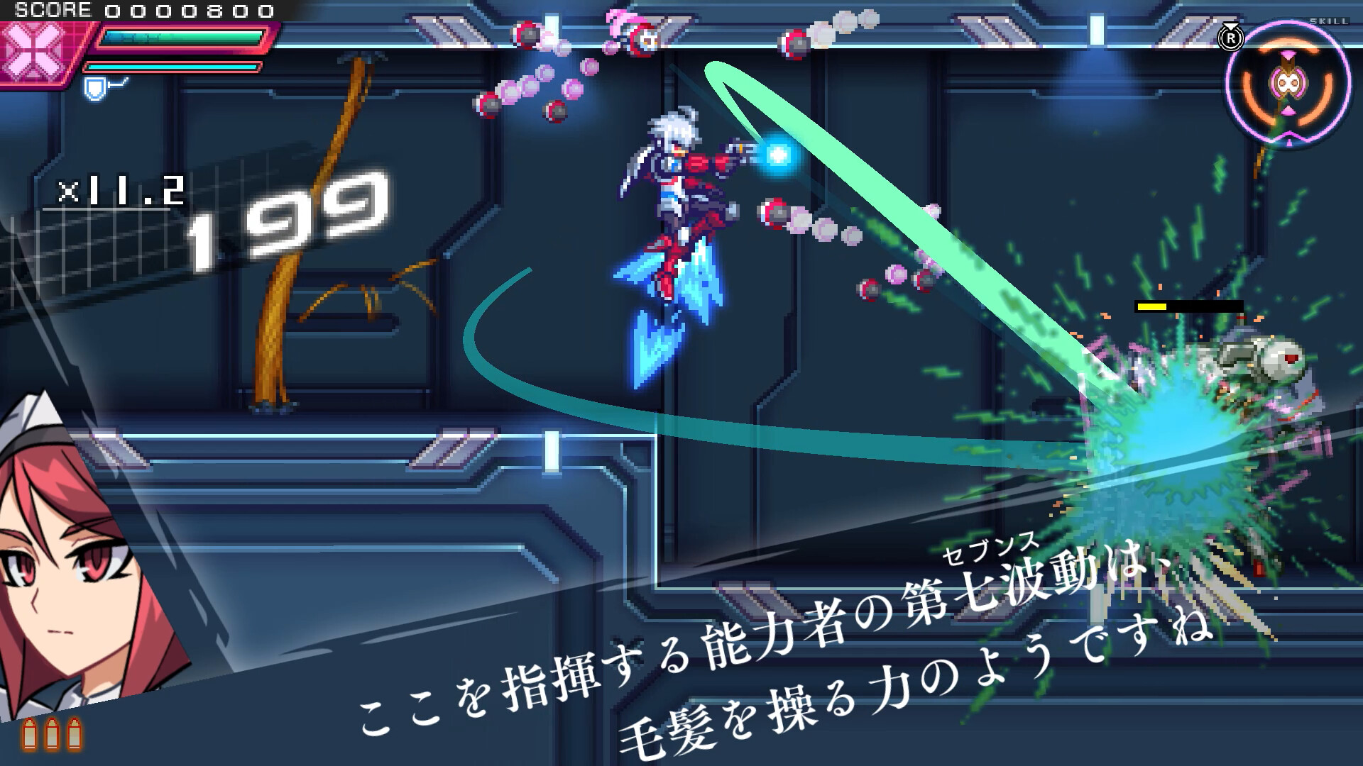 プレイヤーであるガンヴォルトは雷撃の“第七波動(セブンス)”を使い、自由のため皇神グループの能力者たちと激しいバトルを繰り広げます。