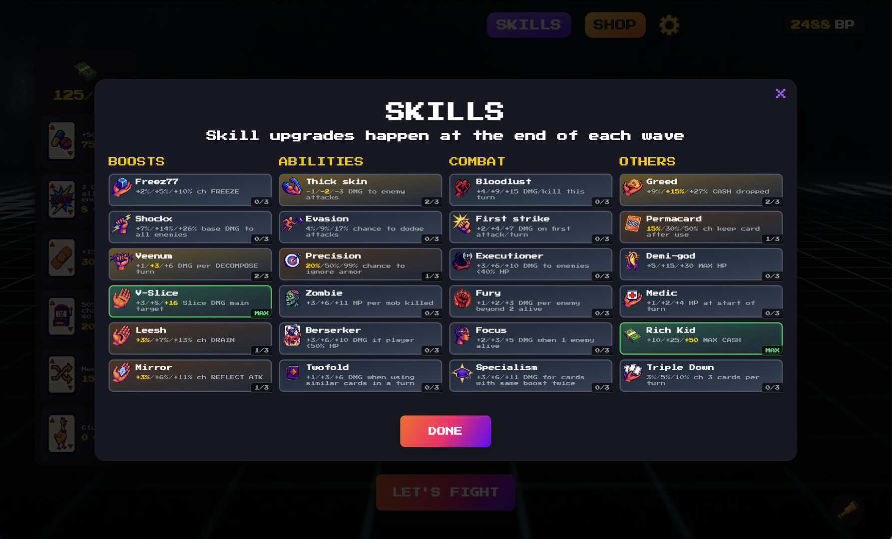 • Shop (permanent): Earn XP to unlock permanent perks, granting small improvements that benefit your future runs.