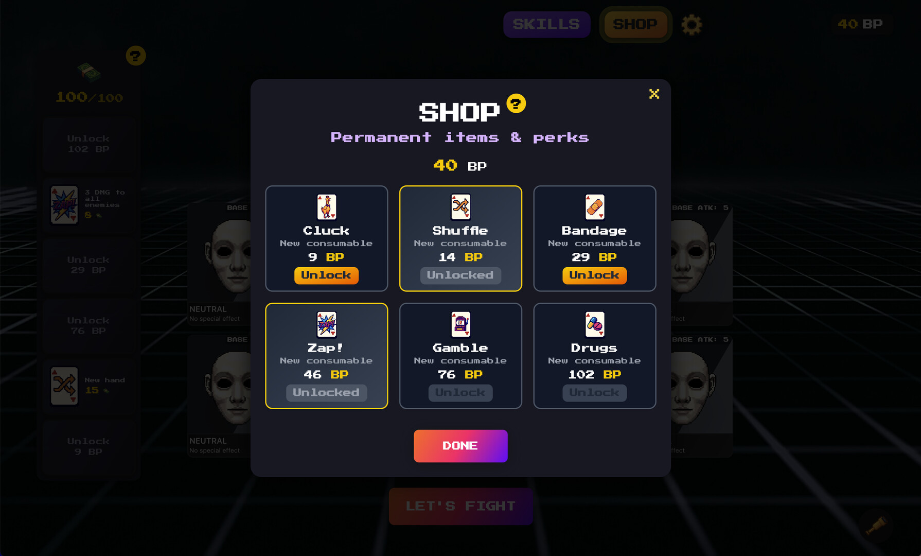 • Shop (permanent): Earn XP to unlock permanent perks, granting small improvements that benefit your future runs.