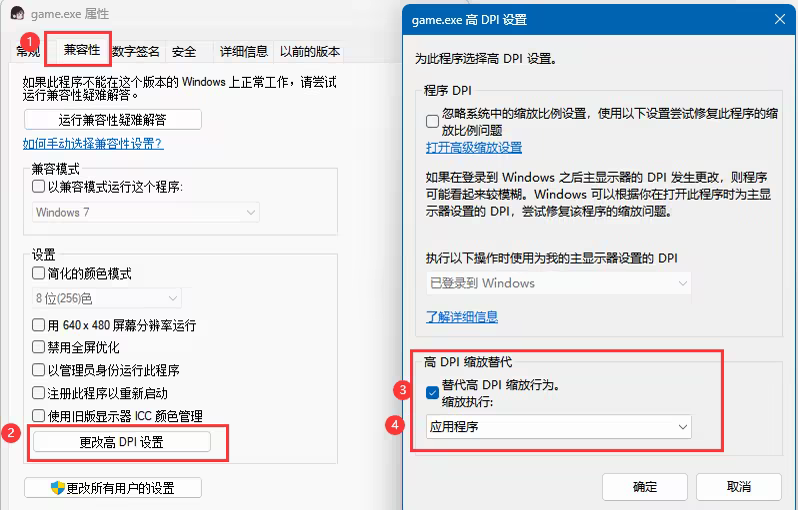 3. In the Properties window, navigate to [Compatibility] -> [Change high DPI settings]. Check the box for [Override high DPI scaling behavior] and set the scaling to be performed by [Application].
