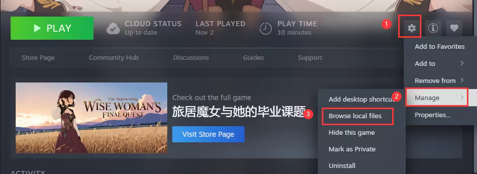 1. On the library page of the game, click [Manage] -> [Browse Local Files].