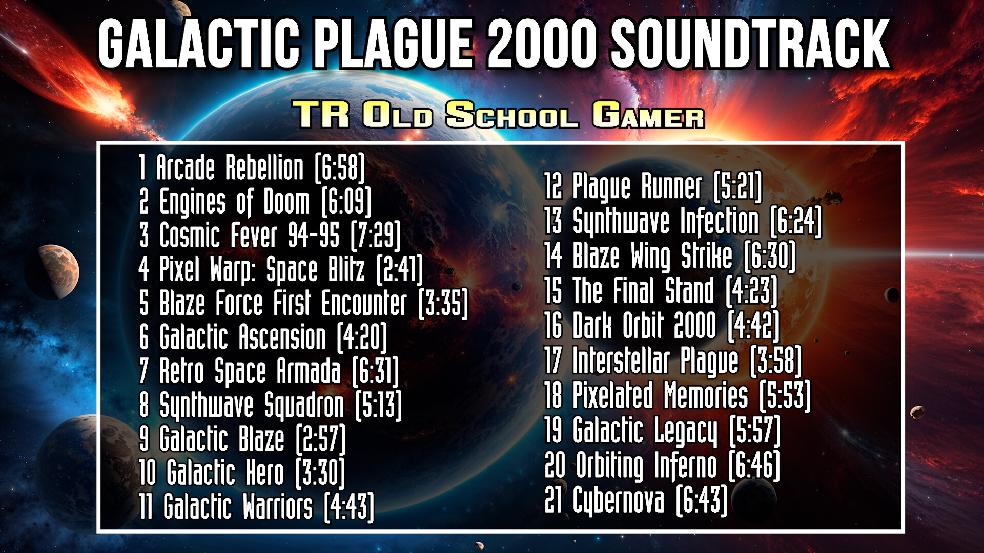 Official soundtrack of Galactic Plague 2000 by TR Old School Gamer, featuring 21 original tracks that accompany the action, tension, and epic boss battles across the game's worlds. Over 2 hours of sci-fi music with a retro 16-bit sound, arcade spirit, atmospheric synths, and powerful cyberpunk energy.