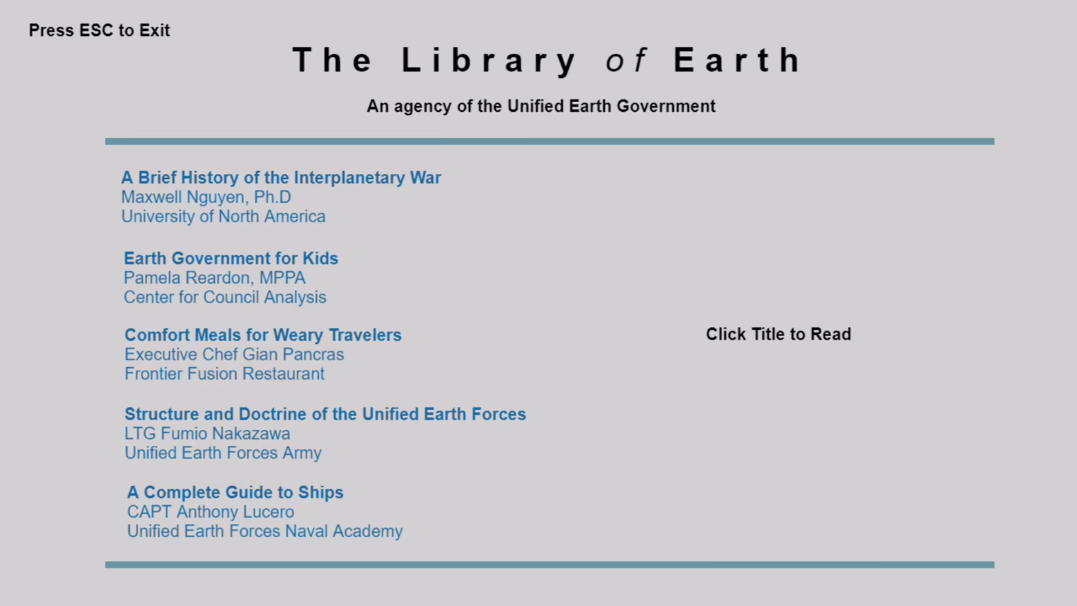 Ready for shore leave?  Fly to Earth and explore the civic and cultural institutions in humanity's capital.  Don't forget to visit the Library of Earth to read about the Interplanetary War, Unified Earth Forces ships, and other interesting topics. Earth will be an area for continued growth during Early Access.