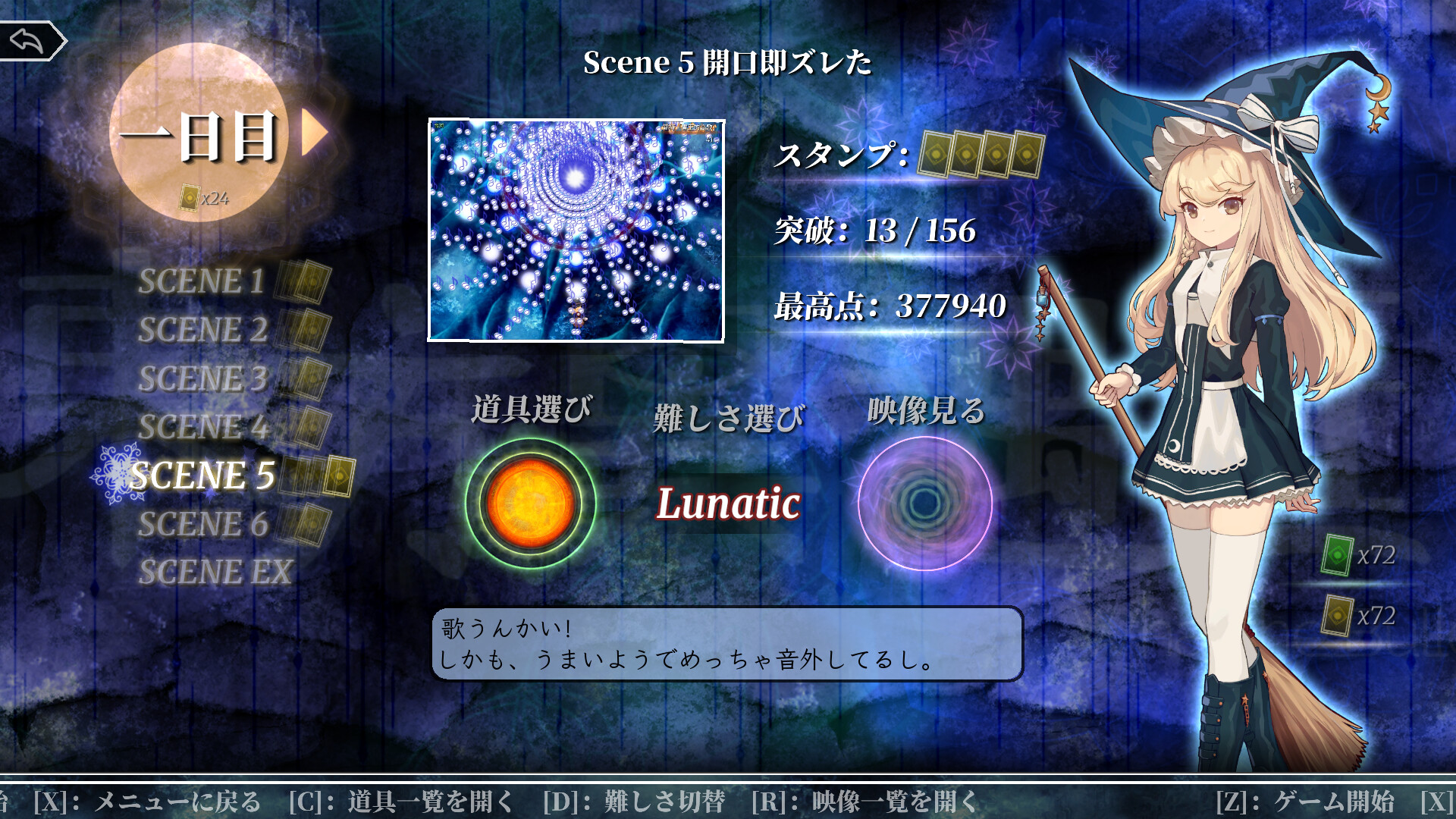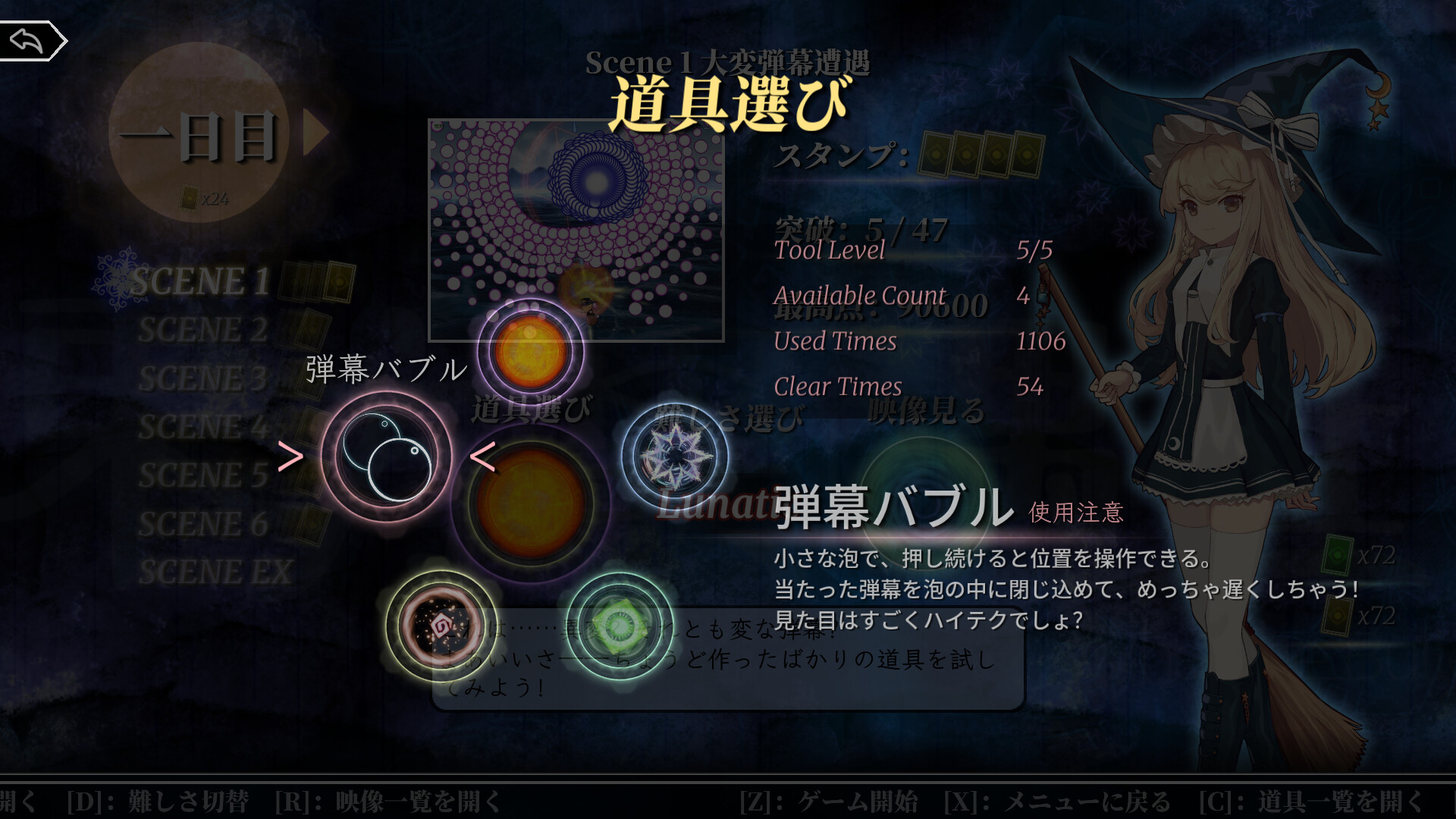 各ステージには Easy / Normal / Hard / Lunatic の4つの難易度を用意。さらに「ノーアイテム」での攻略に挑めば、より高い評価を獲得できます!