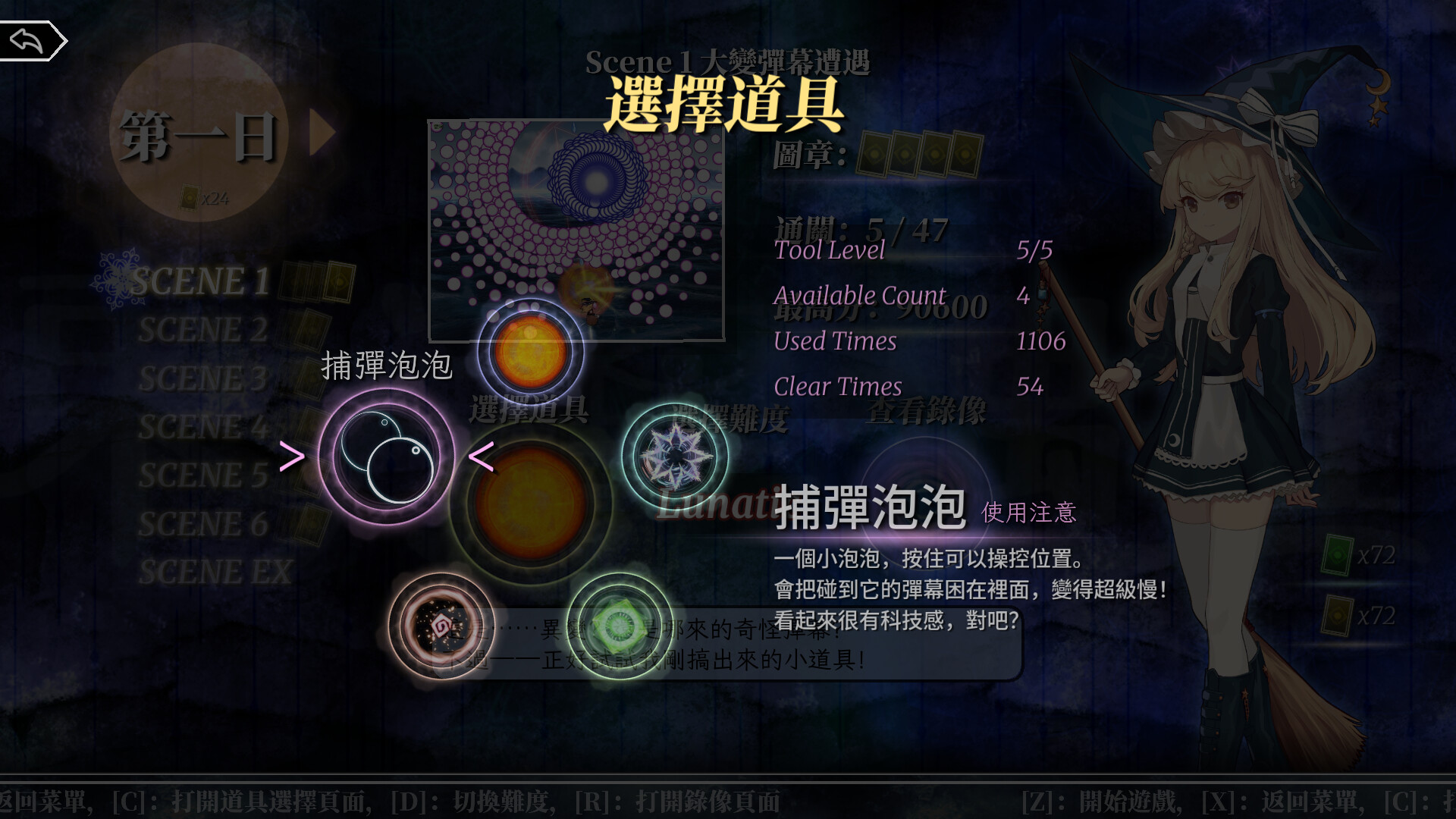 每個關卡可自由選擇難度(Easy / Normal / Hard / Lunatic),同時也可嘗試「無道具通關」來獲得更高榮譽!
