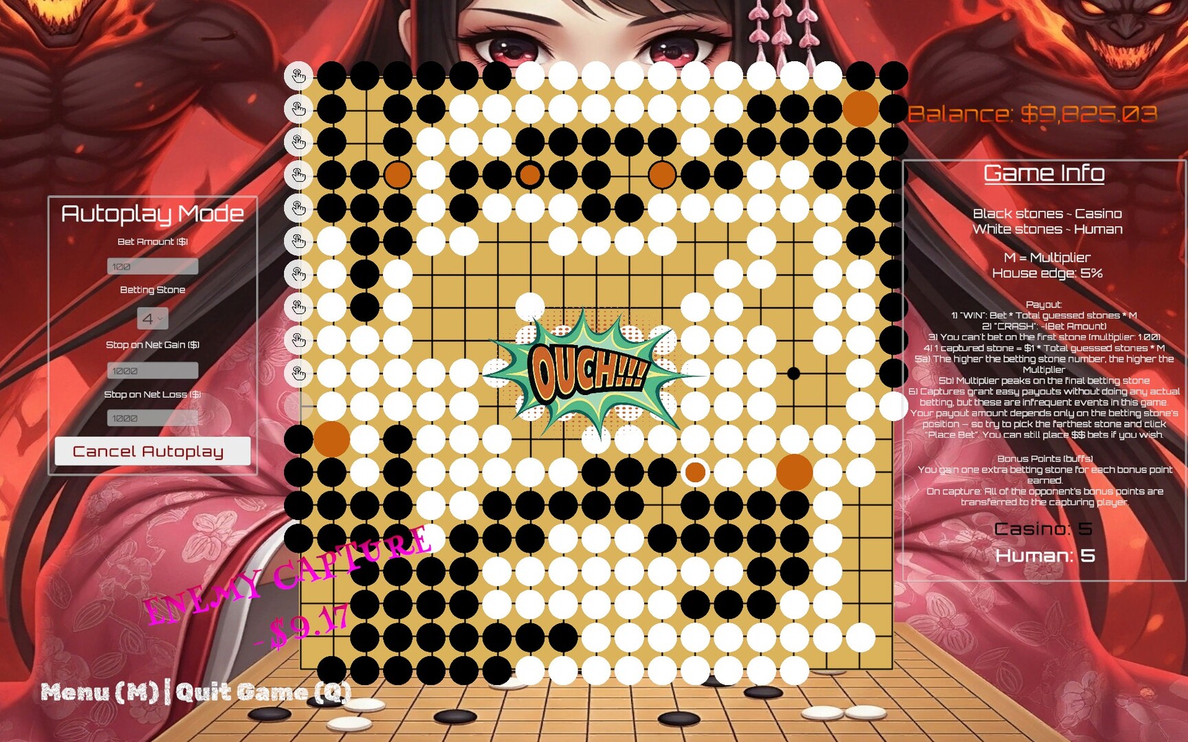 SpiralGo is a turn-based, casino-style twist on Go. Bet against the house, predict spiral stone patterns, and try to outsmart the casino! Risk, reward, and strategy collide in this minimalist board game with a gambling soul. No real money betting involved. Just some wholesome spiral fun!