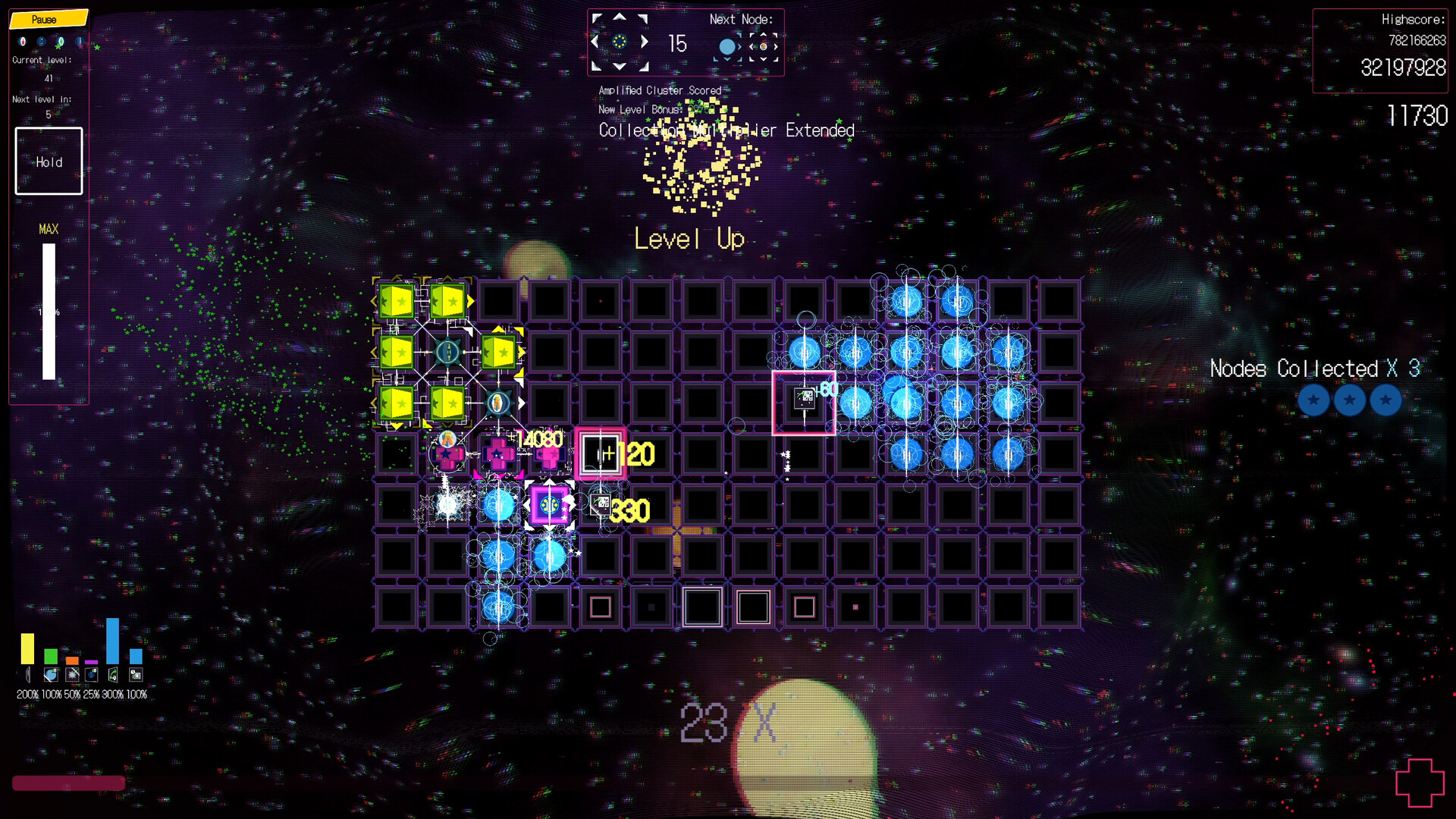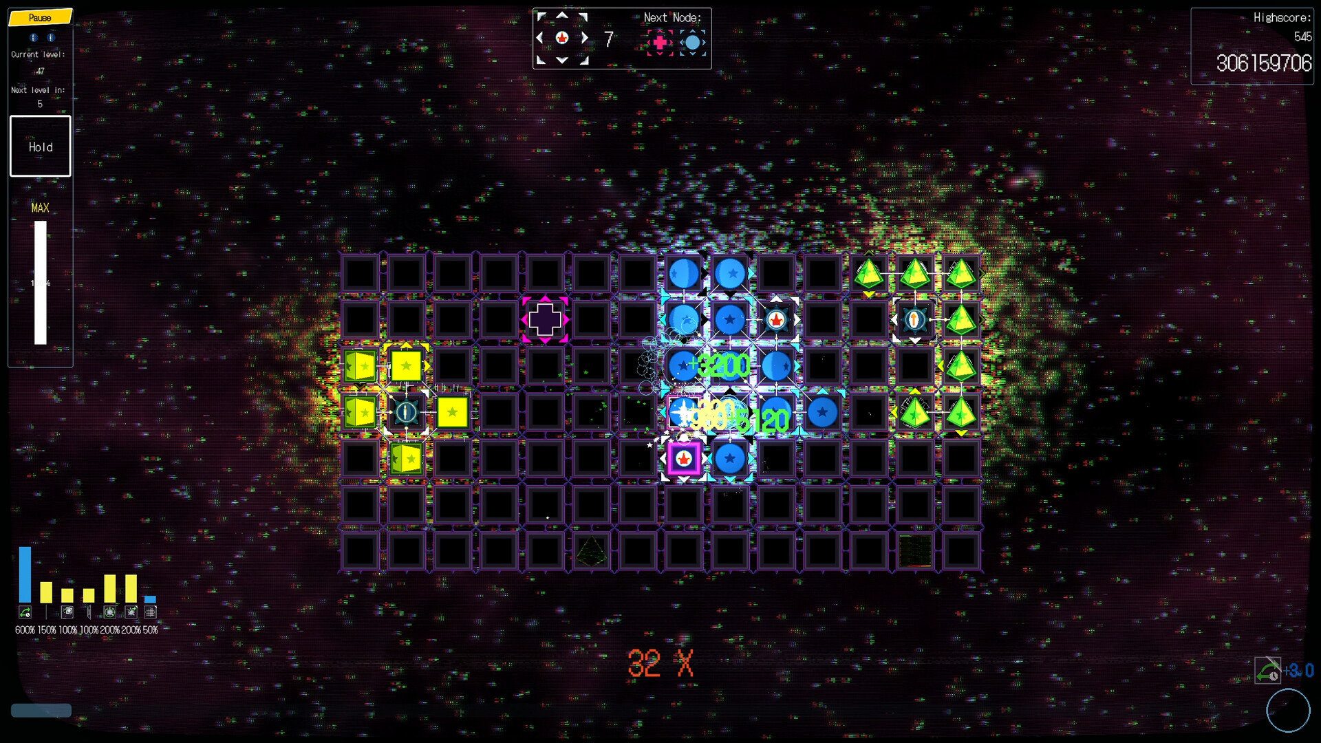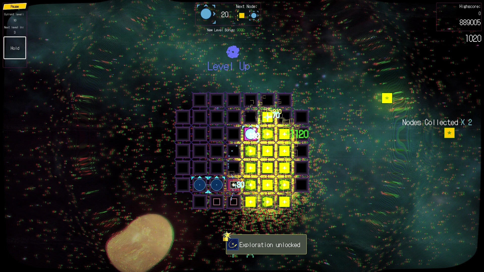 The core gameplay lets you manage and place Nodes onto a grid. Align and connect the Nodes to grow their Cores until they are big enough to collect and score.