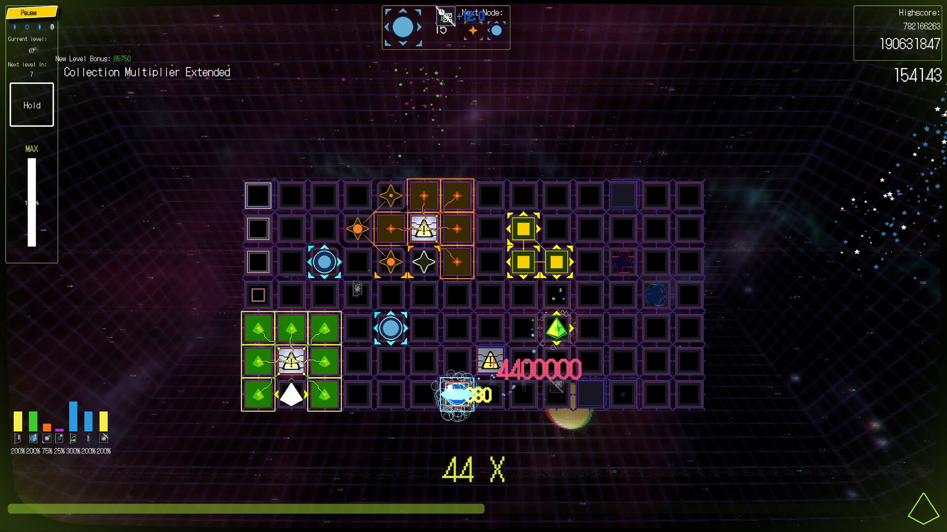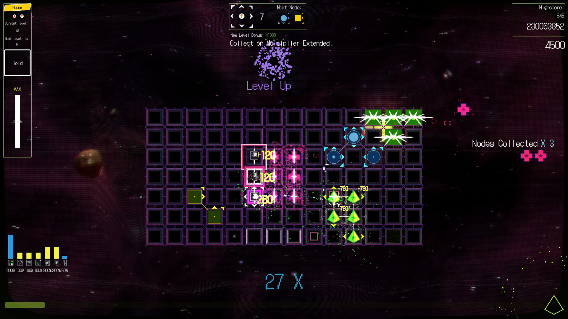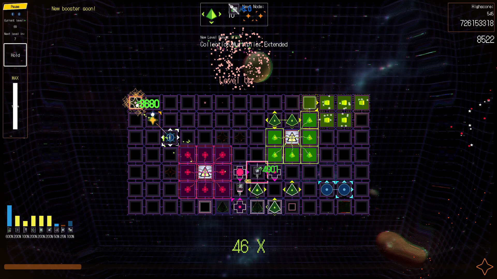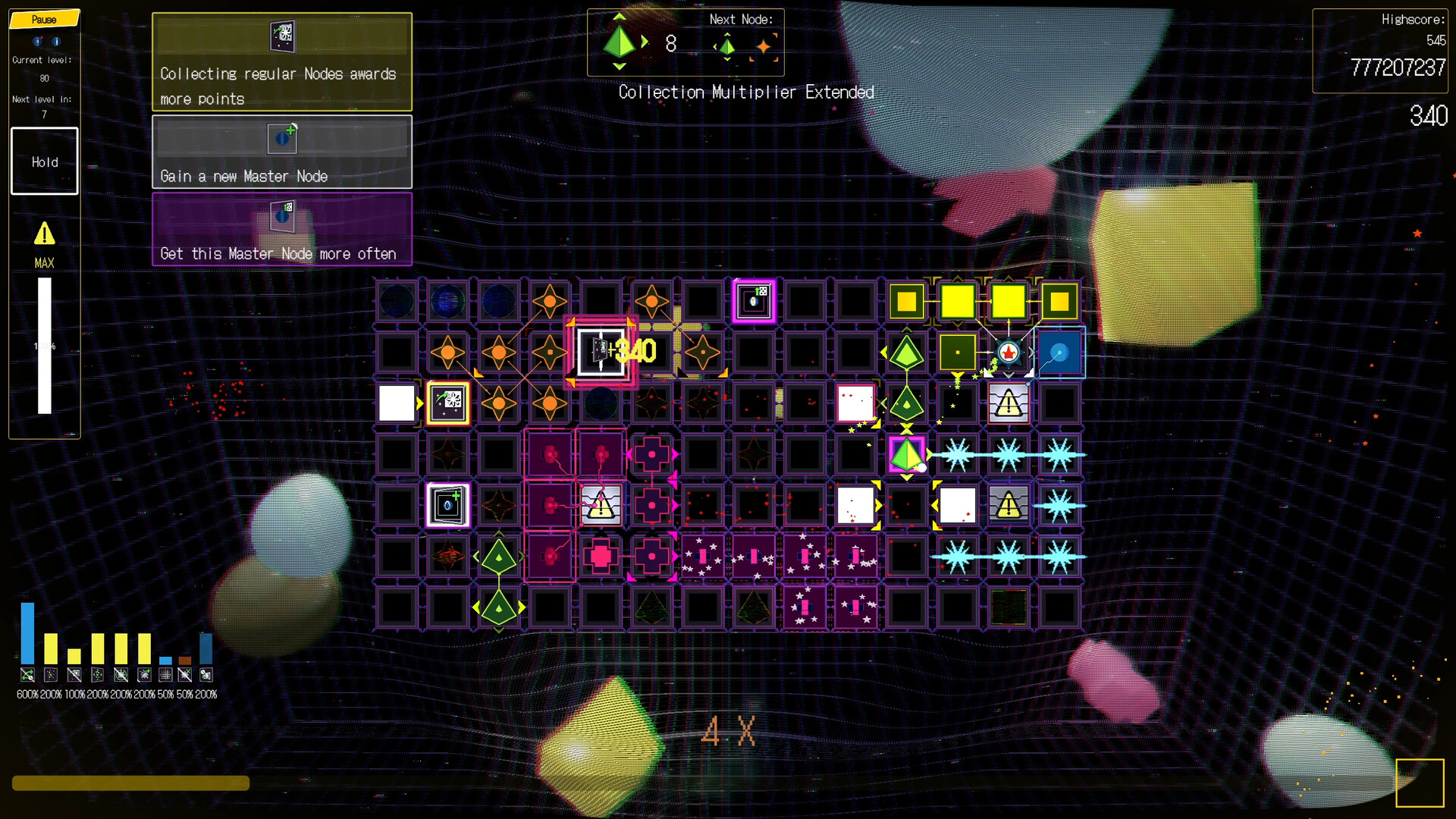 The core gameplay lets you manage and place Nodes onto a grid. Align and connect the Nodes to grow their Cores until they are big enough to collect and score.