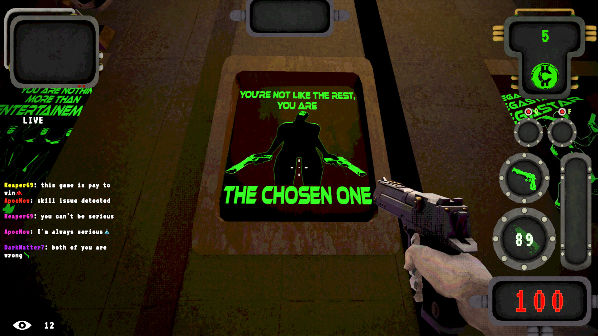 Roguelike shooter set in a dystopian, livestreamed gameshow. Obliterate waves of deformed freaks, earn donations from your sadistic audience and gamble your earnings for upgrades. Your life is a Performance. Your Death is Content.