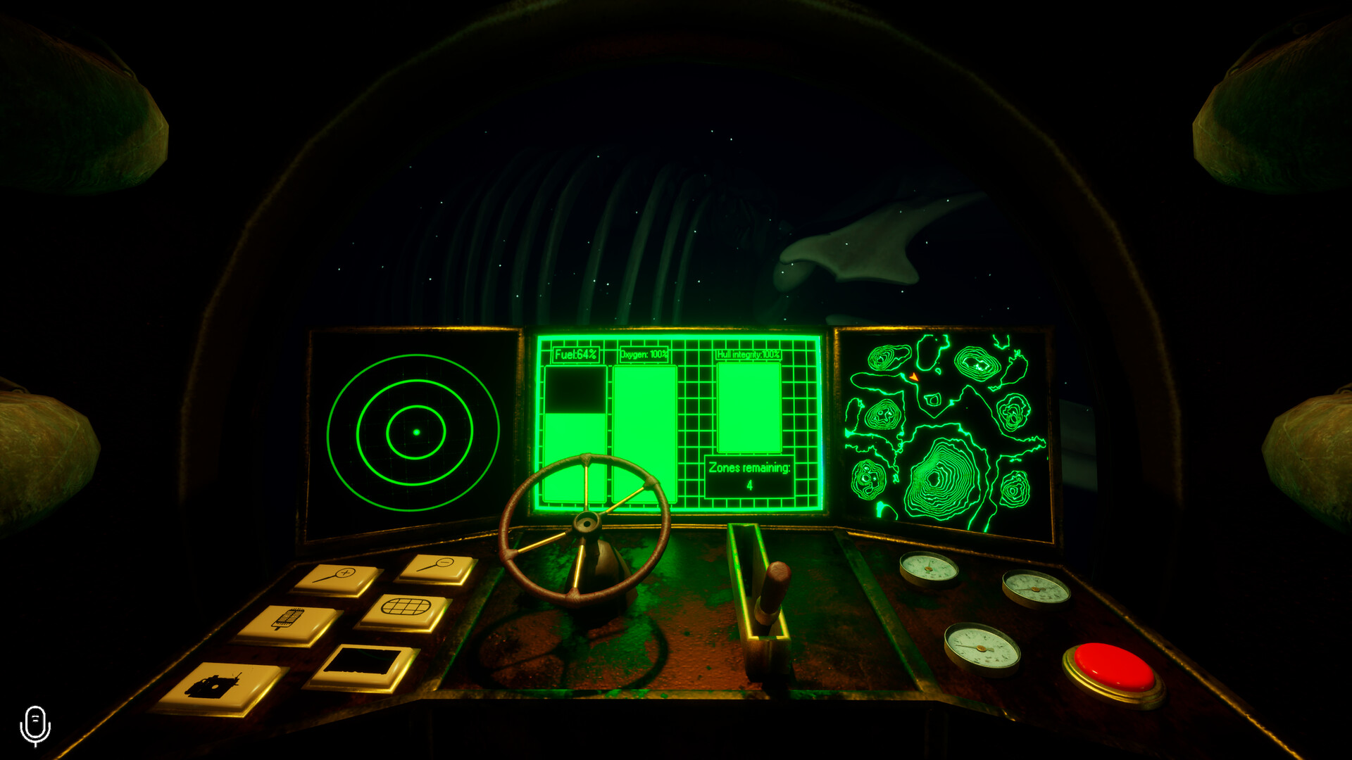 Take control of your rusty research vessel using the navigation console and map. Adjust your speed with the lever and steer using the wheel. Every movement counts — and every sound could be your last.