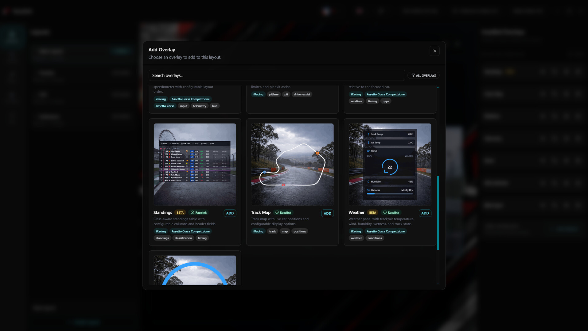 • Use built-in overlays for standings, relatives, track map, weather, wind, flags, telemetry, blind spot alerts, pitlane helper, ABS, and more