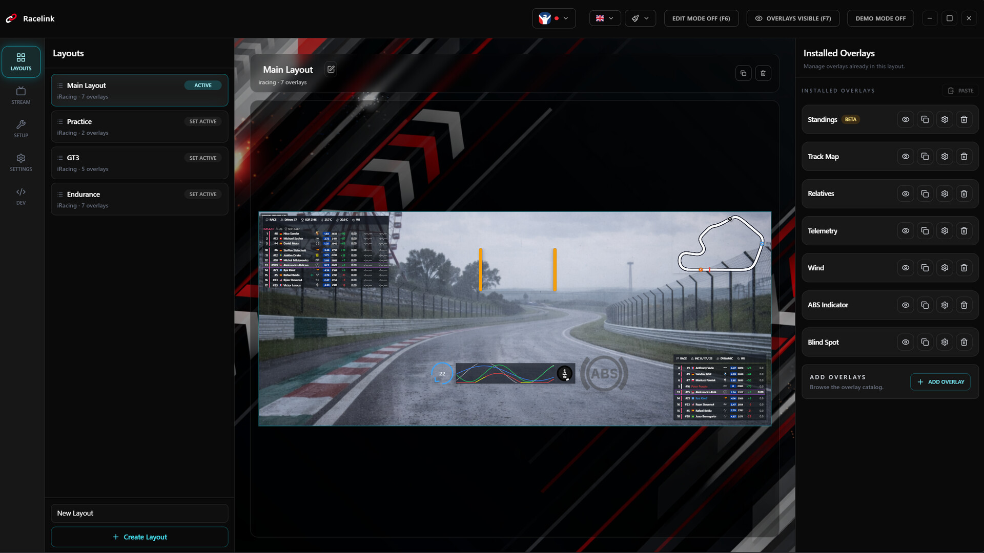 • Use built-in overlays for standings, relatives, track map, weather, wind, flags, telemetry, blind spot alerts, pitlane helper, ABS, and more