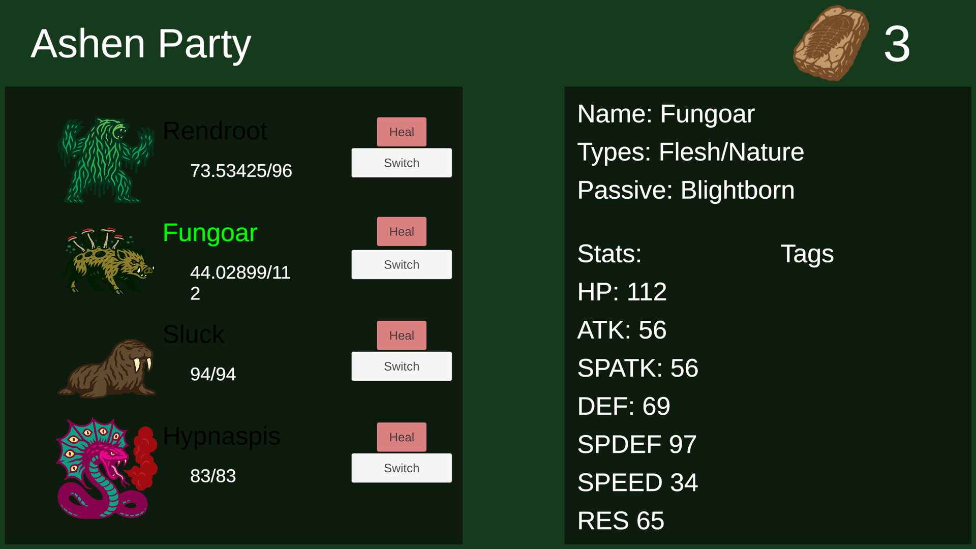 In Ashen World, you obtain the results of a biological weapon known as Ashen. You use these Ashen to battle opponents in a turn-based, 4v4 battle. Your rewards for this battle? Fossils, the primary resource for Ashen World. Fossils can be used to heal your Ashen from damage and dehabilitating status conditions, or they can be used at labs to genetically modify Ashen, splicing new types, passives, and abilities onto them