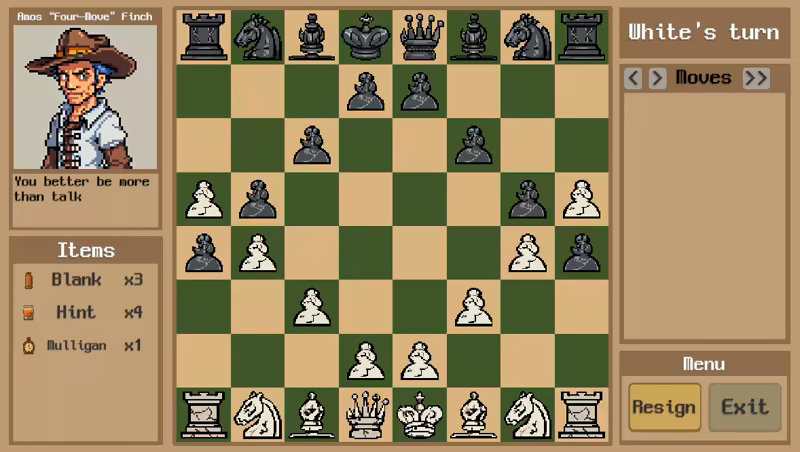 A Wild West chess adventure where every duel is settled on the board—explore towns, solve themed puzzles, and defeat the hall bosses to become a legend.