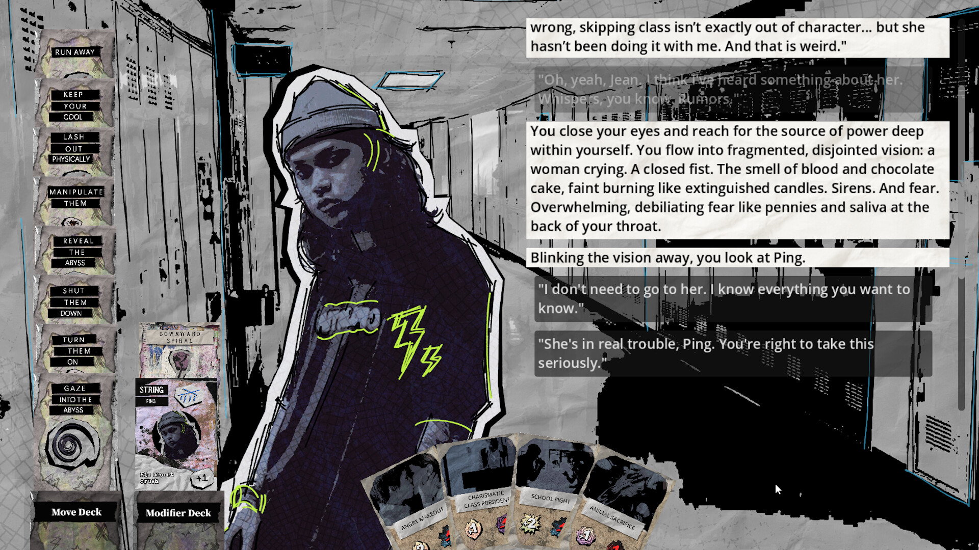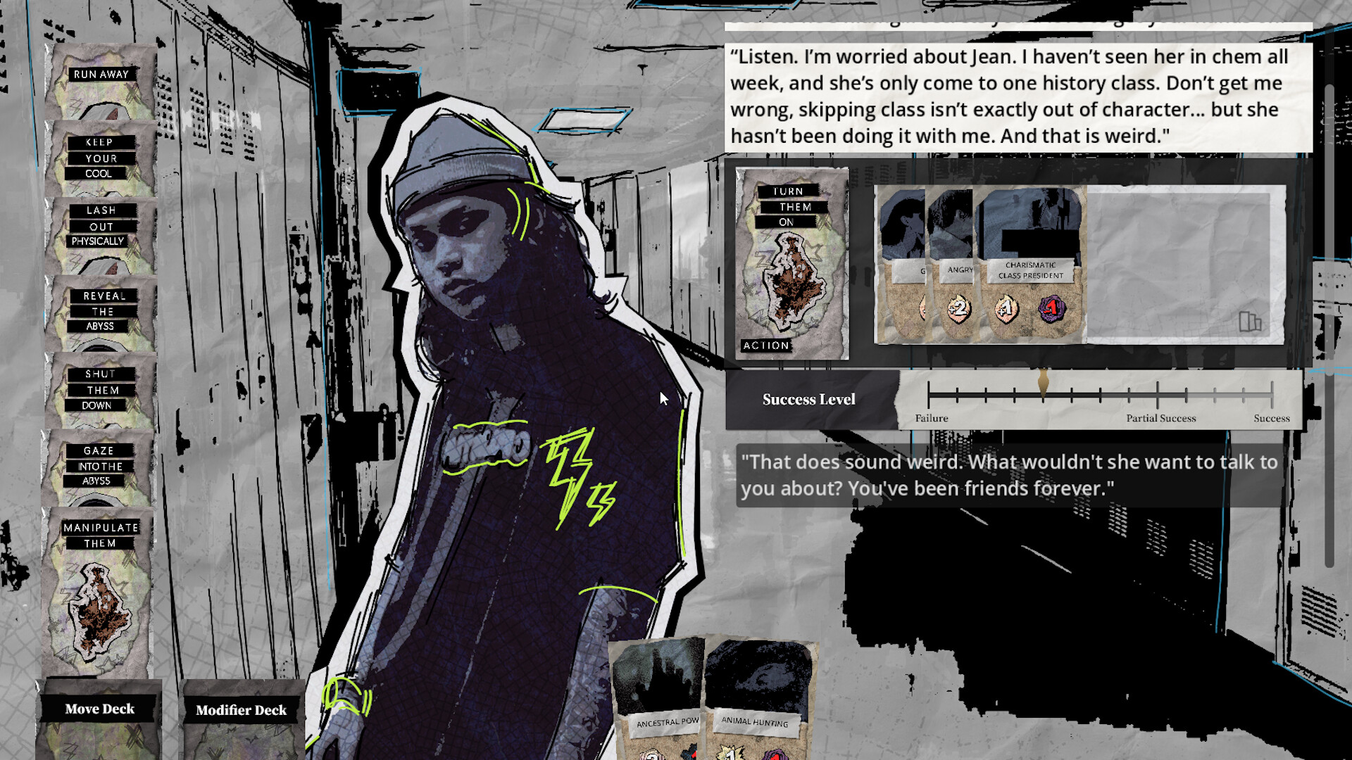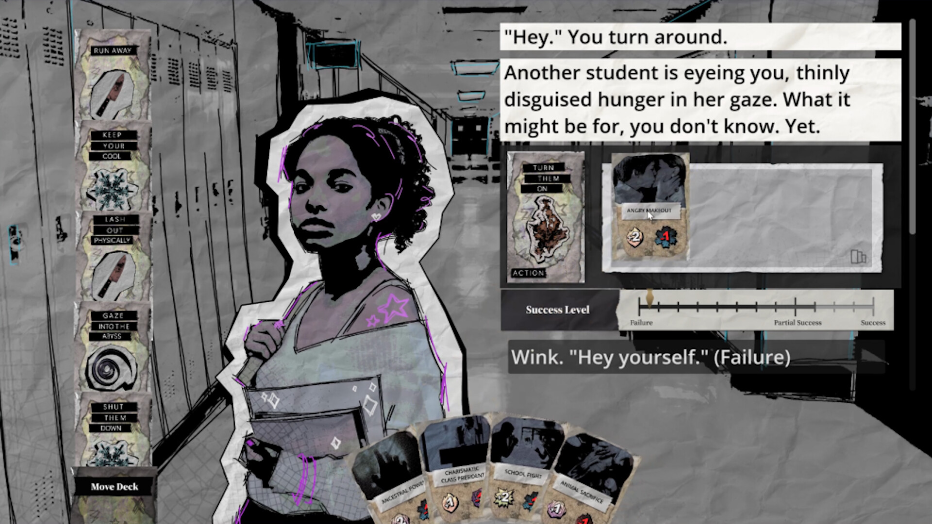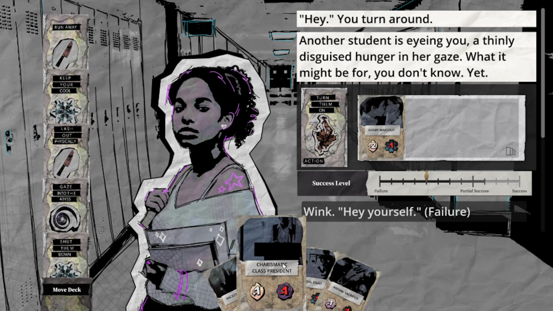 • Your PC encounters NPC enemies, lovers, friends, and frenemies, building beautiful and/or dysfunctional relationships using String cards and relationship meters.
